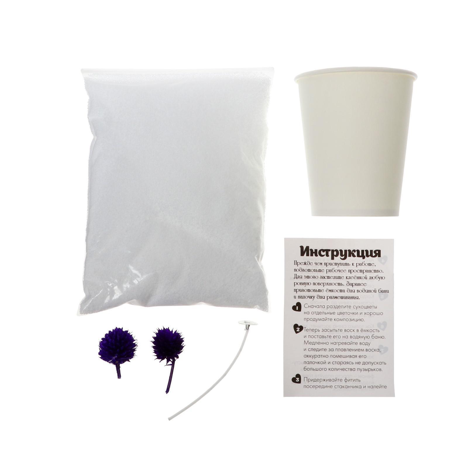 В наборе: воск, стаканчик, сухоцветы, фитиль, инструкция.