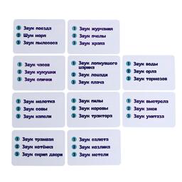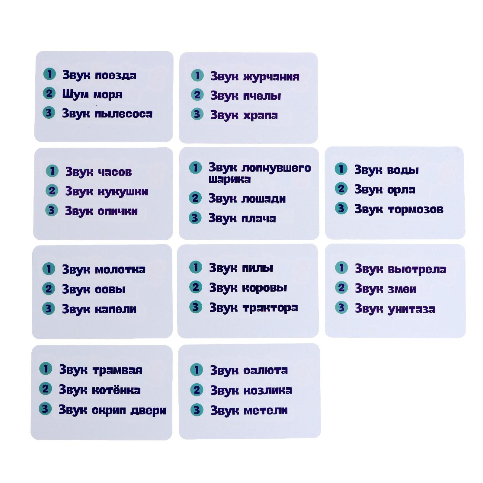 В набор входят 16 кубиков со звуками, поле, карточки-задания, игральный кубик.