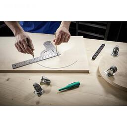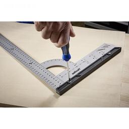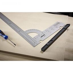 Угольник используется для разметки деталей. Специальные отверстия в полотне позволяют отмечать углы (30° и 40°), быстро чертить параллельные линии и окружности радиусом 40 и 60 мм. Кроме того, инструмент имеет шаблоны под часто используемые мебельные крепления (петля, ответная планка для петли, стяжка RAFIX/MINIFIX).