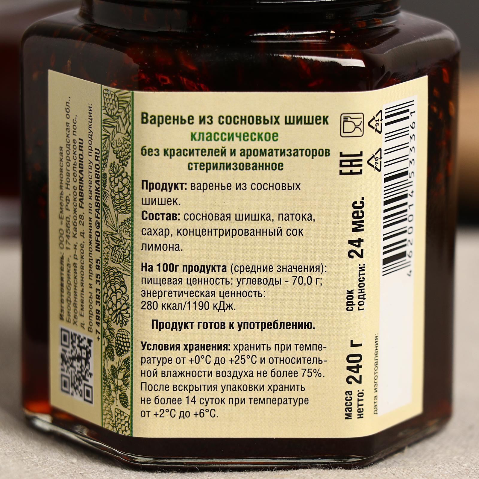 Варенье из шишек сосны старинное средство, богатое витаминами и микроэлементами. Молодые сосновые шишки собираются в экологически чистых лесных районах Новгородской области. В нем используется только натуральные компоненты, чтобы сохранить все целебные свойства, заложенные Природой. Это вкусное, общеукрепляющее лакомство поможет поддержать иммунитет и полезно при простудах, кашле, бронхитах.