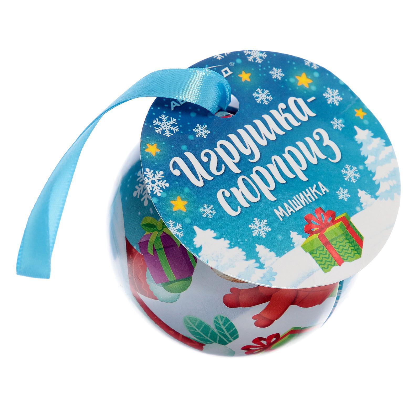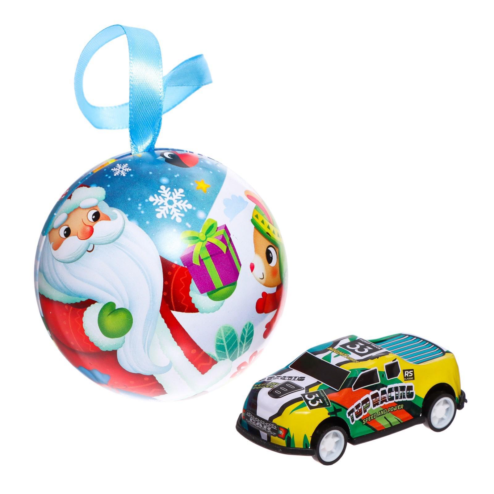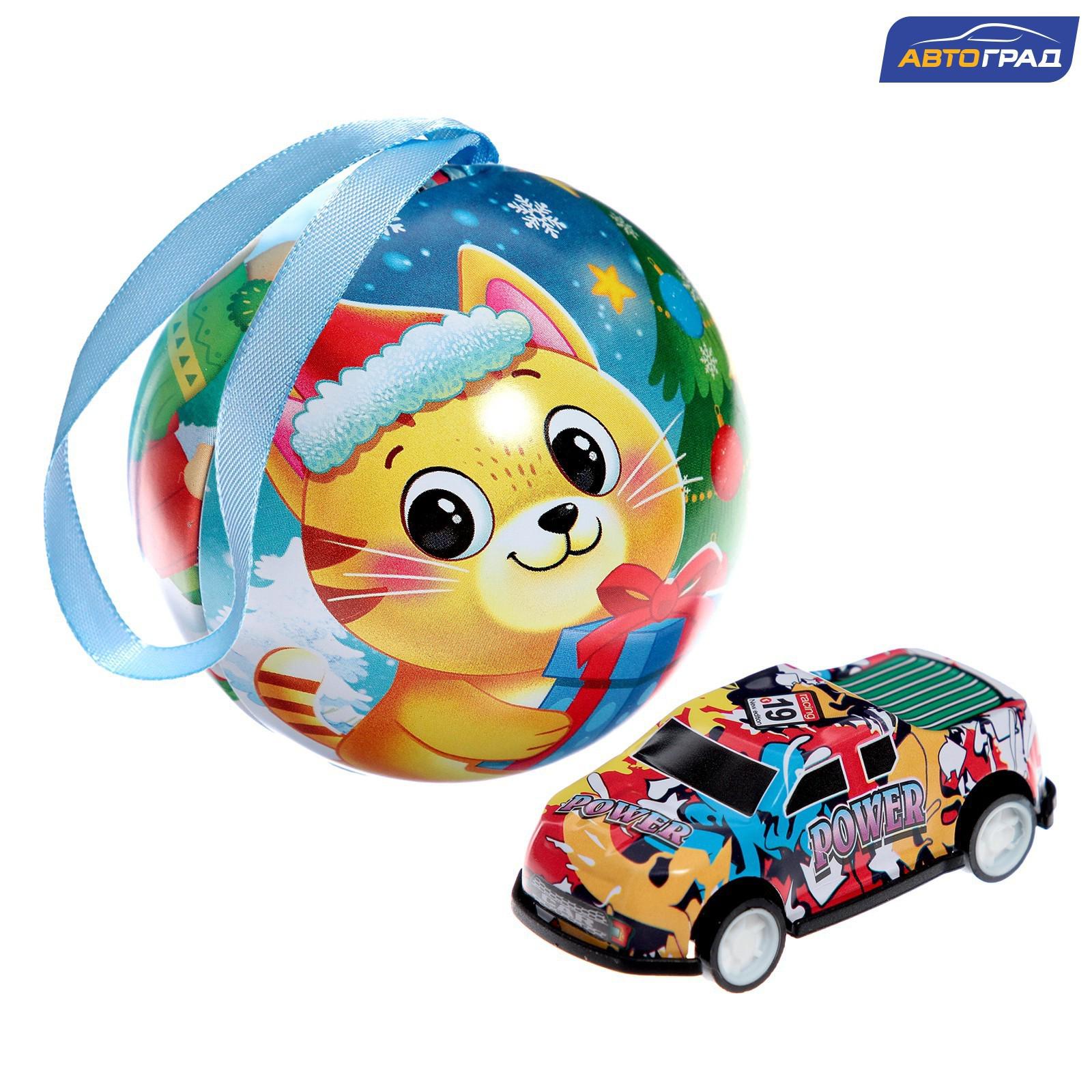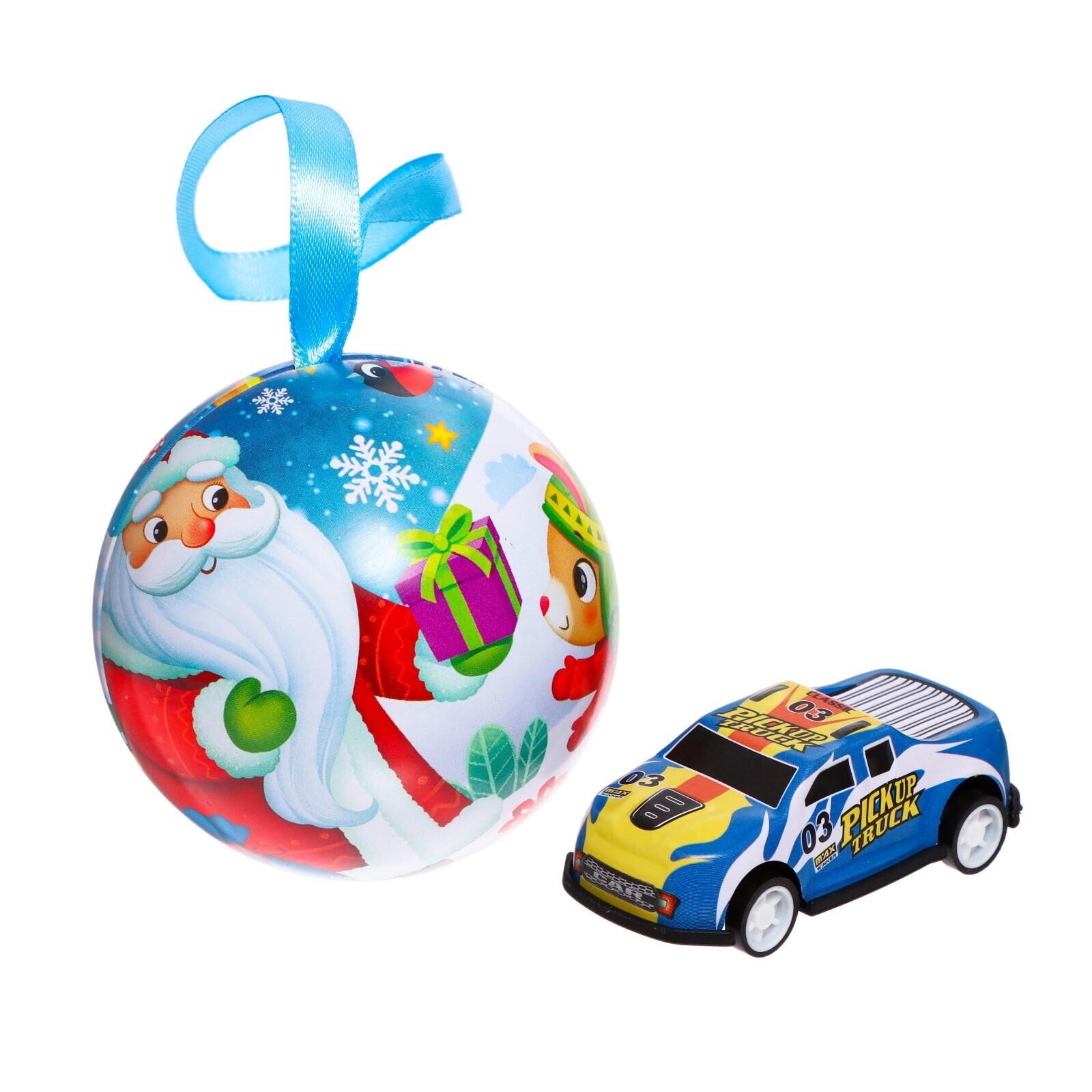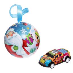 Металлическая машина в шаре подойдёт для дополнения основного подарка или как презент для малышей в детском саду на новогодний утренник.