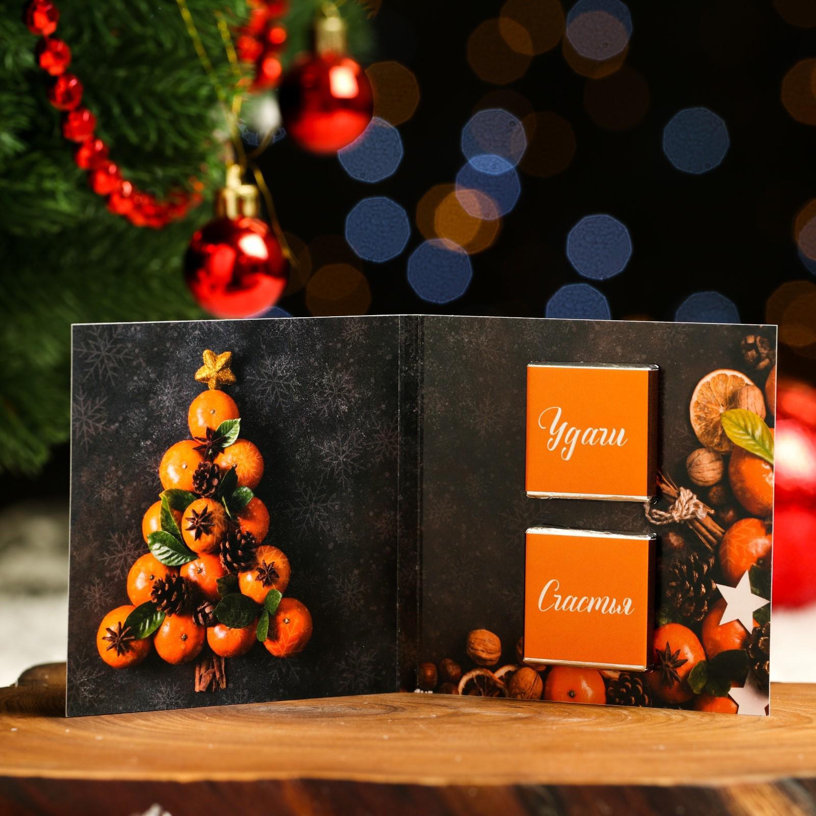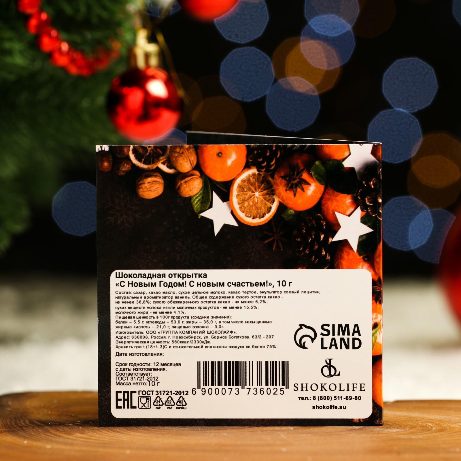 Шоколадная открытка – необычный и оригинальный способ поздравить с Новым годом! В ассортименте представлены интересные, забавные пожелания на любой вкус. Внутри каждой открытки вы найдёте маленькую шоколадку из настоящего шоколада высокого качества от российских и бельгийских производителей. Благодаря качественному составу, ваш сюрприз будет не только красивым, но и действительно вкусным!