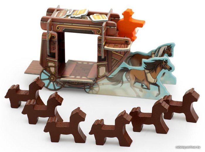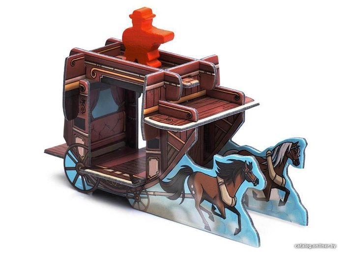 - Комплектация 1 дилижанс, 1 фигурка охранника, 6 фигурок лошадей, 1 кейс стоимостью 1000$, 5 фляжек виски, 1 фляжка выдержанного виски, 6 карт действий Верхом на лошади, 8 карт Заложников, 3 нейтральные карты пули, 13 карт раундов.