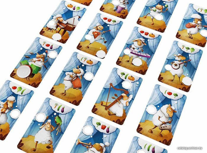 Комплектация16 планшетов овец; 16 карт волков; 24 простые кодовые карты; 16 сложных кодовых карт; 32 жетона музыкальных инструментов (2 комплекта по 16 инструментов); 36 овощей (27 спелых и 9 гнилых); 1 мешочек для овощей; 1 переводчик Бубл; 1 счётчик раундов; 1 фигурка коварного волка; правила игры на русском языке.