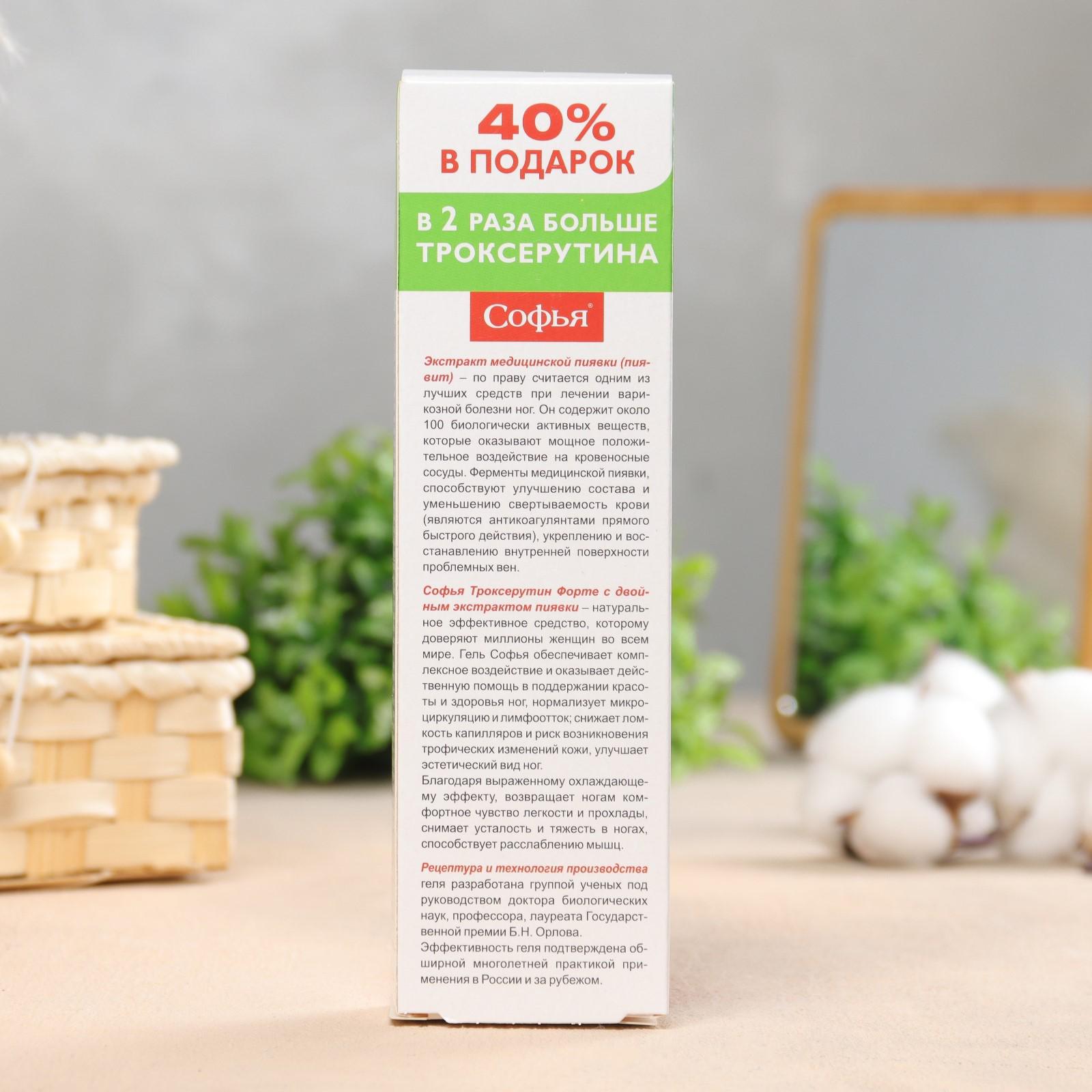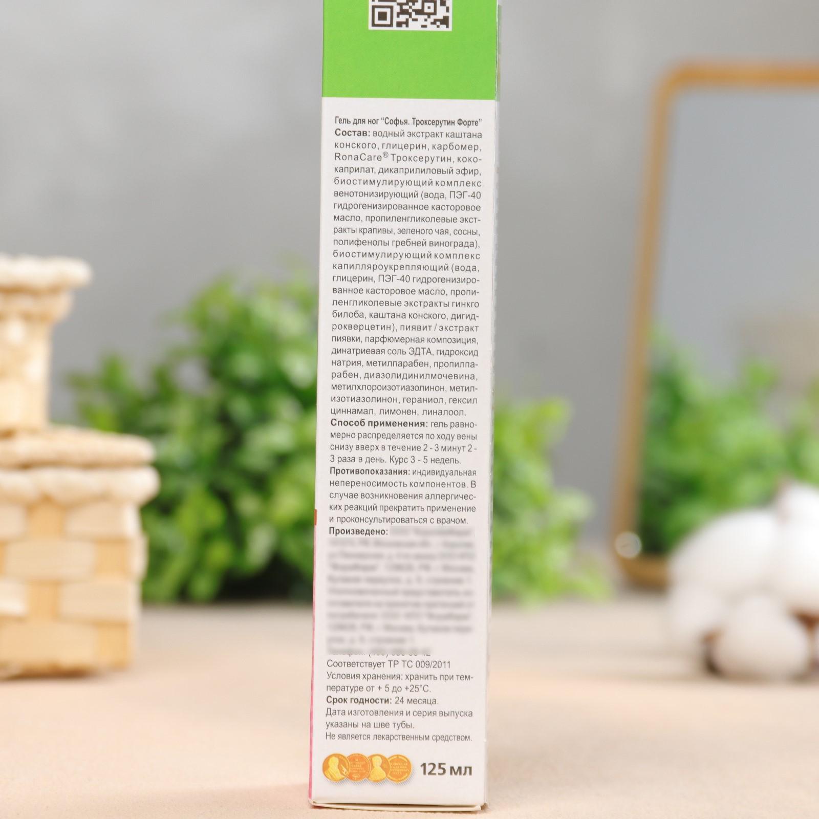Софья Троксерутин Форте- натуральное эффективное средство, которому доверяют миллионы женщин во всем мире. Гель Софья обеспечивает комплексное воздействие и оказывает действенную помощь в поддержании красоты и здоровья ног, нормализует микроциркуляцию и лимфоотток, снижает ломкость капилляров и риск возникновения трофических изменений кожи. Улучшает эстетический вид ног.