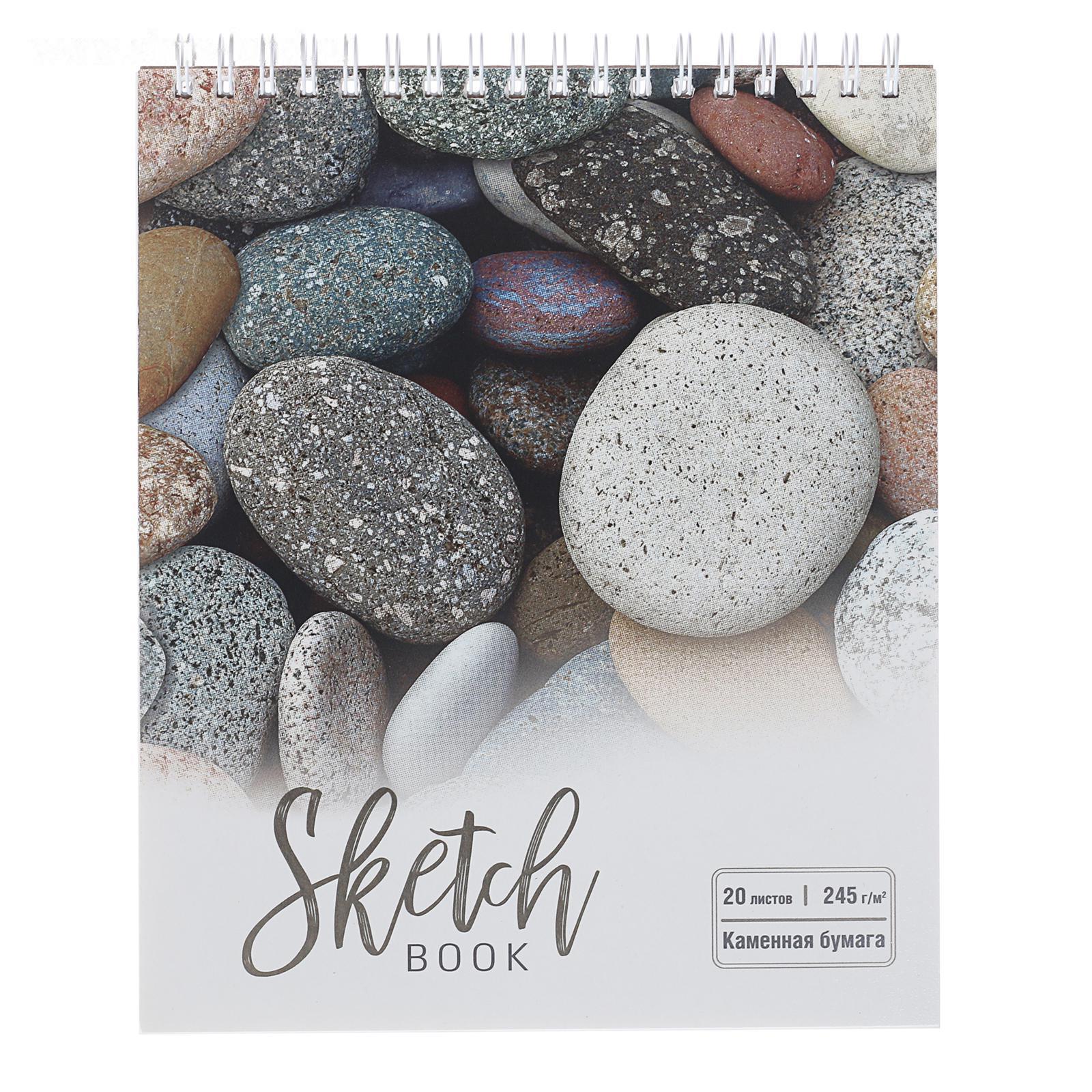 Скетчбук А5, 20 листов на гребне "Камушки", обложка мелованный картон, жёсткая подложка, тиснение фольгой, выборочный УФ-лак, блок каменная бумага 245 г/м²