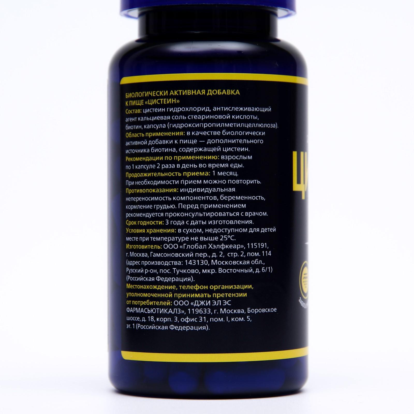 Состав: цистеин гидрохлорид, антислеживающий агент кальциевая соль стеариновой кислоты, биотин, капсула (гидроксипропилметилцеллюлоза).