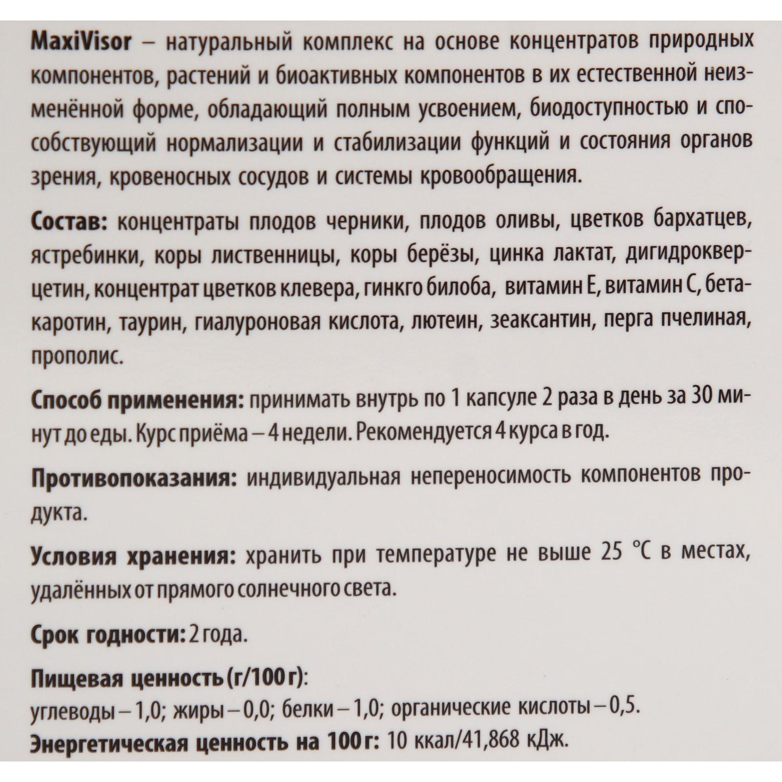 Натуральный природный комплекс MaxiVisor способствует: снятию усталости и напряжения глаз от повышенной нагрузки; улучшению сумеречного зрения; повышению остроты зрения при его снижении в результате напряжения и усталости; уничтожению вирусной, микробной и бактериальной инфекций; устранению воспалительного процесса; предупреждению изменения роговицы глаза в результате вирусной инфекции; предотвращению вероятности помутнения хрусталика; снижению вероятности возникновения глаукомы; предотвращению изменения сетчатки в результате инфекции или повреждений; снижению светочувствительности; устранению нарушений циркуляции влаги; нормализации капиллярного кровообращения и улучшению тонуса сосудов; предупреждению нарушения функций и состояния глазного дна. Натуральный комплекс MaxiVisor не содержит консервантов, гормонов, синтетических и генномодифицированных веществ, не обладает тератогенным действием, возможен приём в детском возрасте и беременным женщинам.