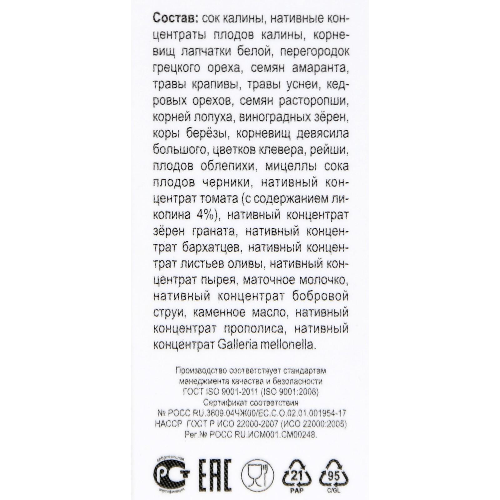 Состав: сок калины, нативные концентраты плодов калины, корневищ лапчатки белой, перегородок грецкого ореха, семян амаранта, травы крапивы, травы уснеи, кедровых орехов, семян расторопши, корней лопуха, виноградных зёрен, коры берёзы, корневищ девясила большого, цветков клевера, рейши, плодов облепихи, мицеллы сока плодов черники, нативный концентрат томата (с содержанием ликопина 4%), нативный концентрат зёрен граната, нативный концентрат бархатцев, нативный концентрат листьев оливы, нативный концентрат пырея, маточное молочко, нативный концентрат бобровой струи, каменное масло, нативный концентрат прополиса, нативный концентрат Galleria mellonella.