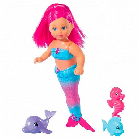 Кукла Evi Love (Эви Лав) - Swimming Mermaid (Русалочка) от бренда SIMBA. Волшебная Evi (Эви) имеет подвижный хвост и вместе со своими друзьями плавает в морских глубинах. Мини-кукла "Еви-русалка" порадует любую девочку и надолго увлечет ее. Малышка Еви выглядит как настоящая русалка! На ней голубой с фиолетовым купальник, а вместо ножек - настоящий хвост с плавником. Ярко-розовые волосы убраны в высокий хвостик. В наборе с куколкой морской конек и две рыбки. Руки и голова куклы подвижны, благодаря чему ей можно придавать разнообразные позы.