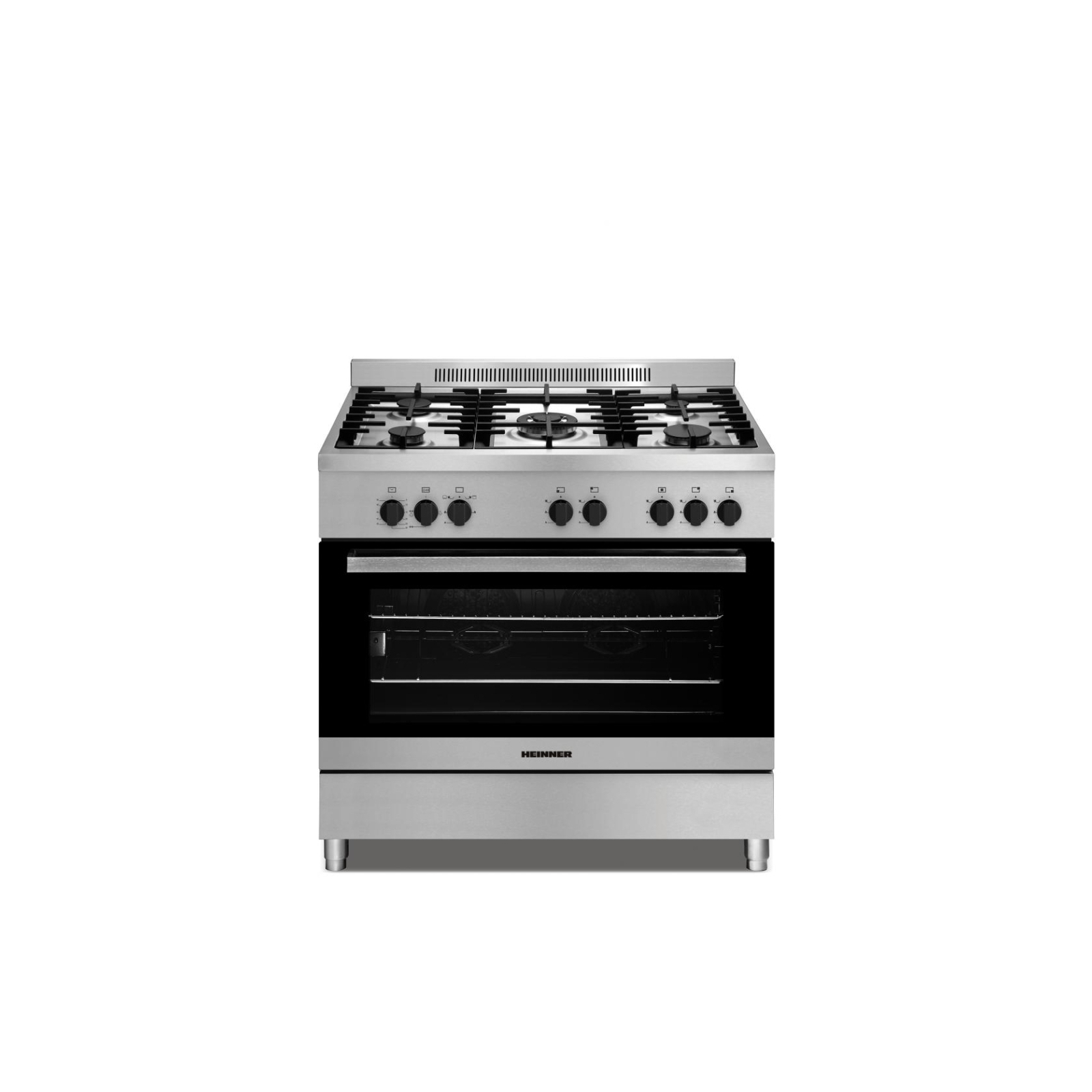 Напівпрофесійна газова плита Heinner HFSC-S90LITGR-IX, 90x60см, 5 газових конфорок, WOK конфорка, Чавунна підставка для сковороди, Автопідпал для варильної поверхні та духовки, Газова безпечна плита та духовка, Таймер, Гриль, Вертел, Внутрішнє освітлення духовки, Знімна подвійні скляні дверцята духовки, нижня шухляда, газовий відстійник, запасні насадки для скрапленого газу в комплекті, деко та решітка, розміри (ШxГxВ): 89,8x62,8x91 см, Колір: нержавіюча сталь