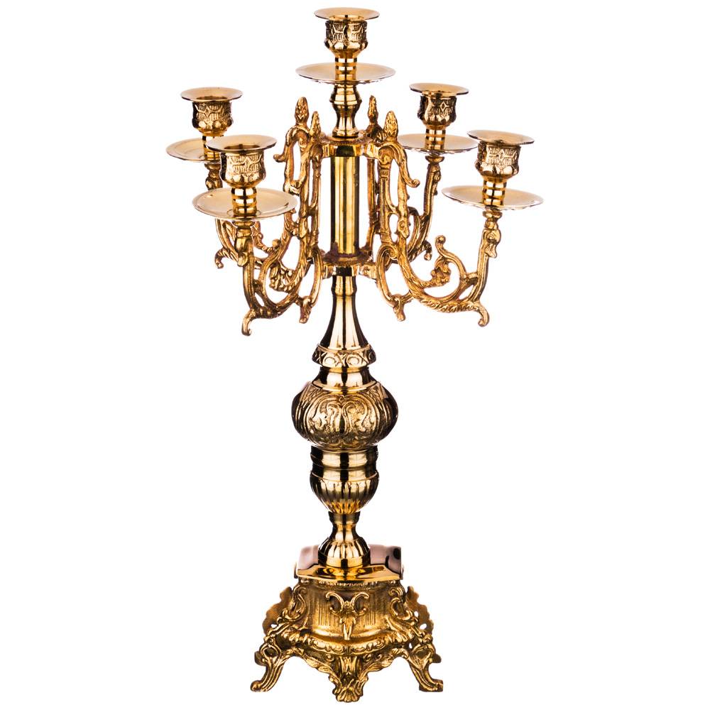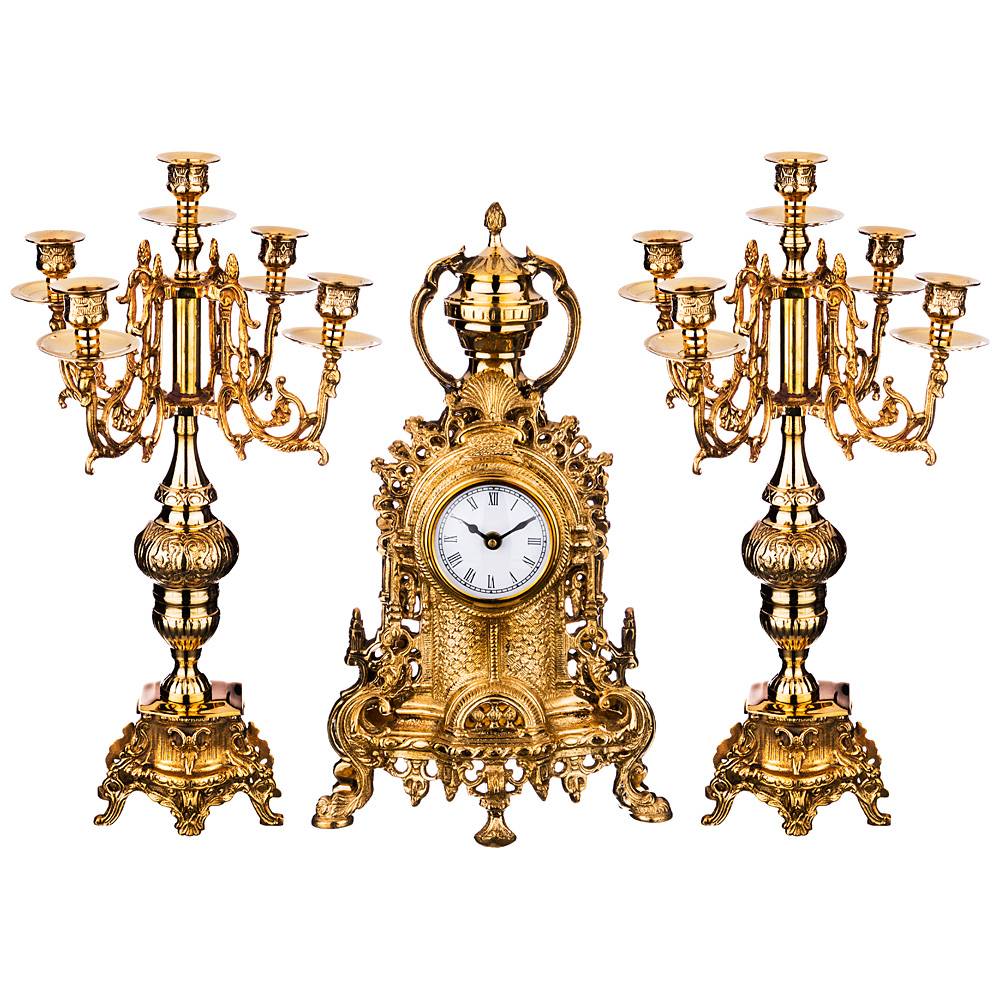 Изысканный латунный набор изготовлен индийскими мастерами и включает в себя настольные часы и два канделябра.