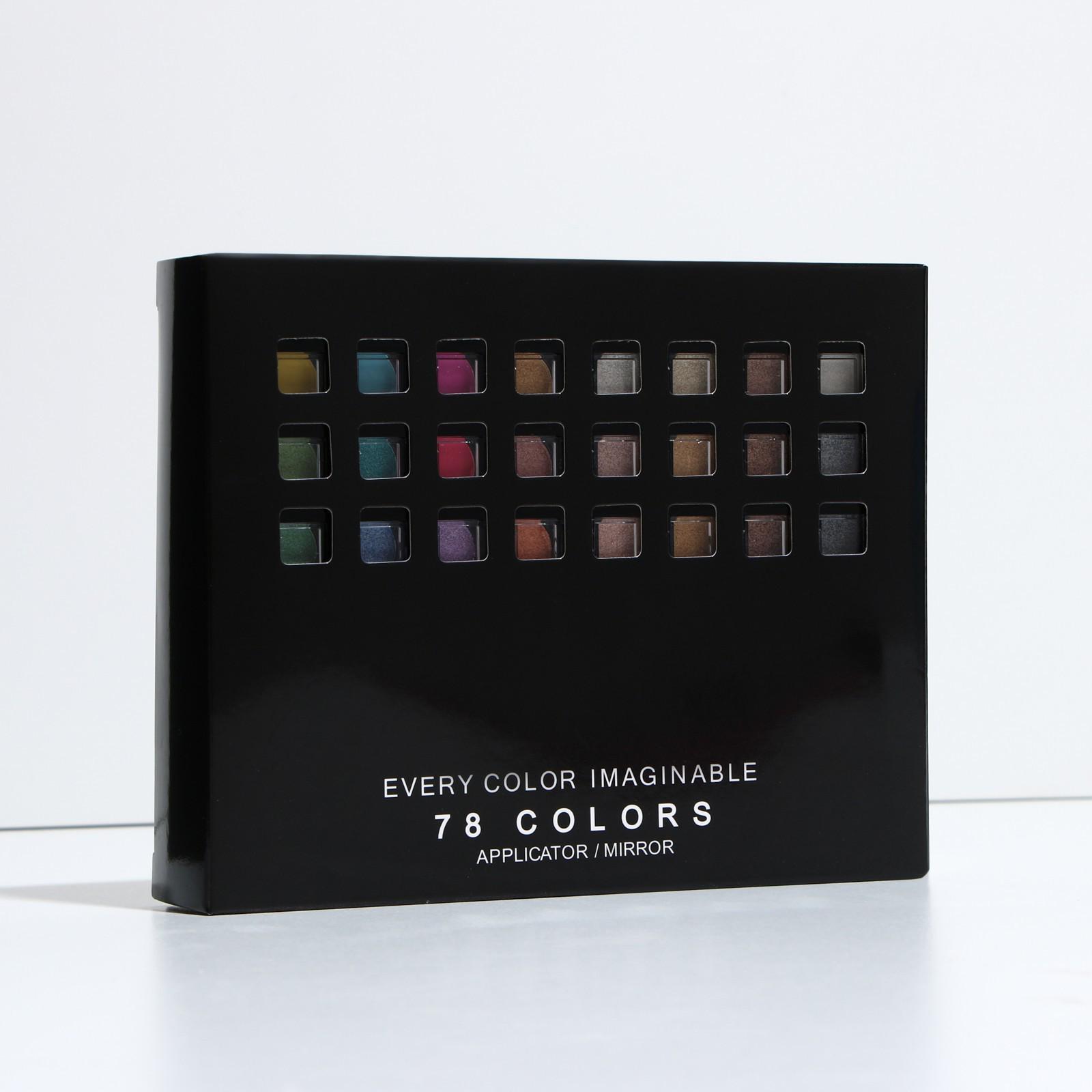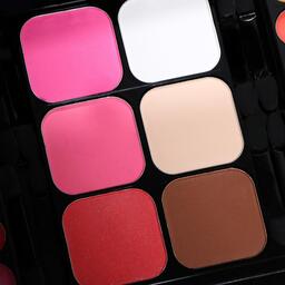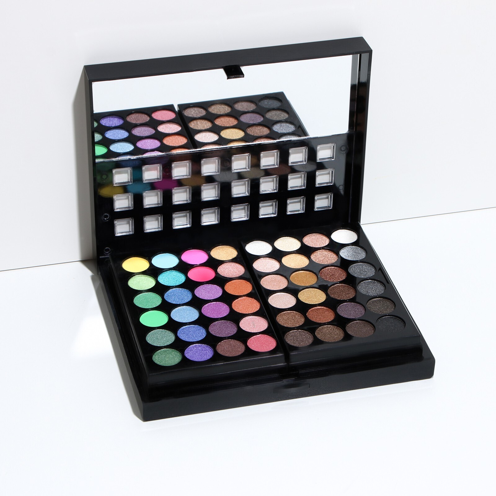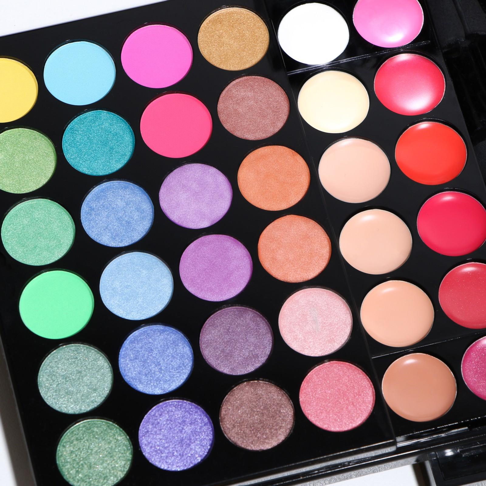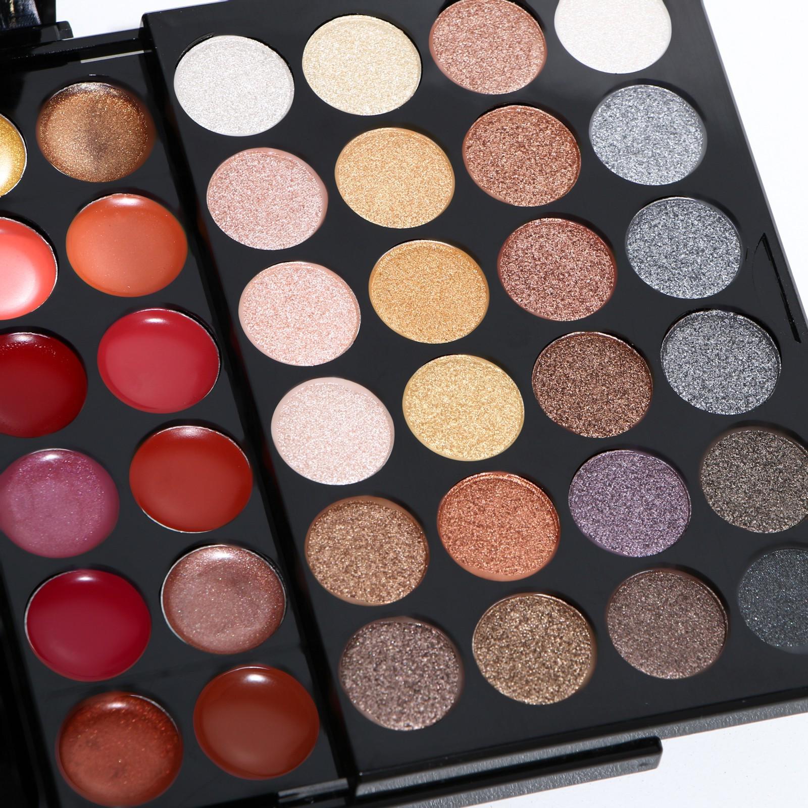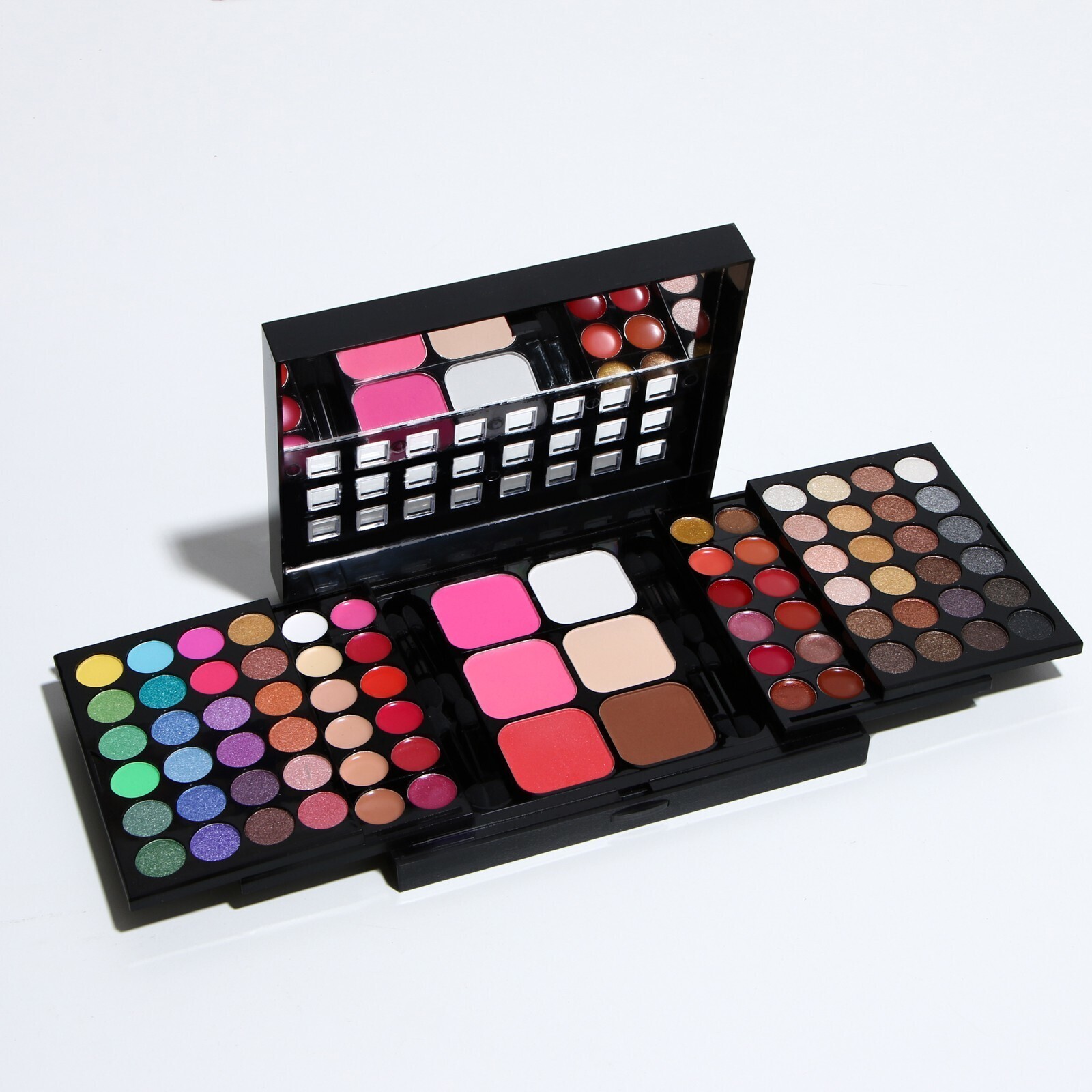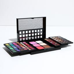 Бьюти-кейс с высококачественной профессиональной косметикой: 48 оттенков теней, 24 блеска для губ, 3 румяна, 3 корректора, большое удобное зеркало и 8 аппликаторов в комплекте.