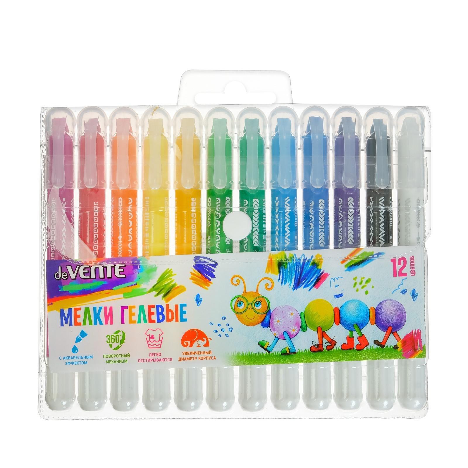 Мелки гелевые 12 цветов deVENTE, супермягкие, с акварельным эффектом, пластиковый корпус с поворотным механизмом, в блистере