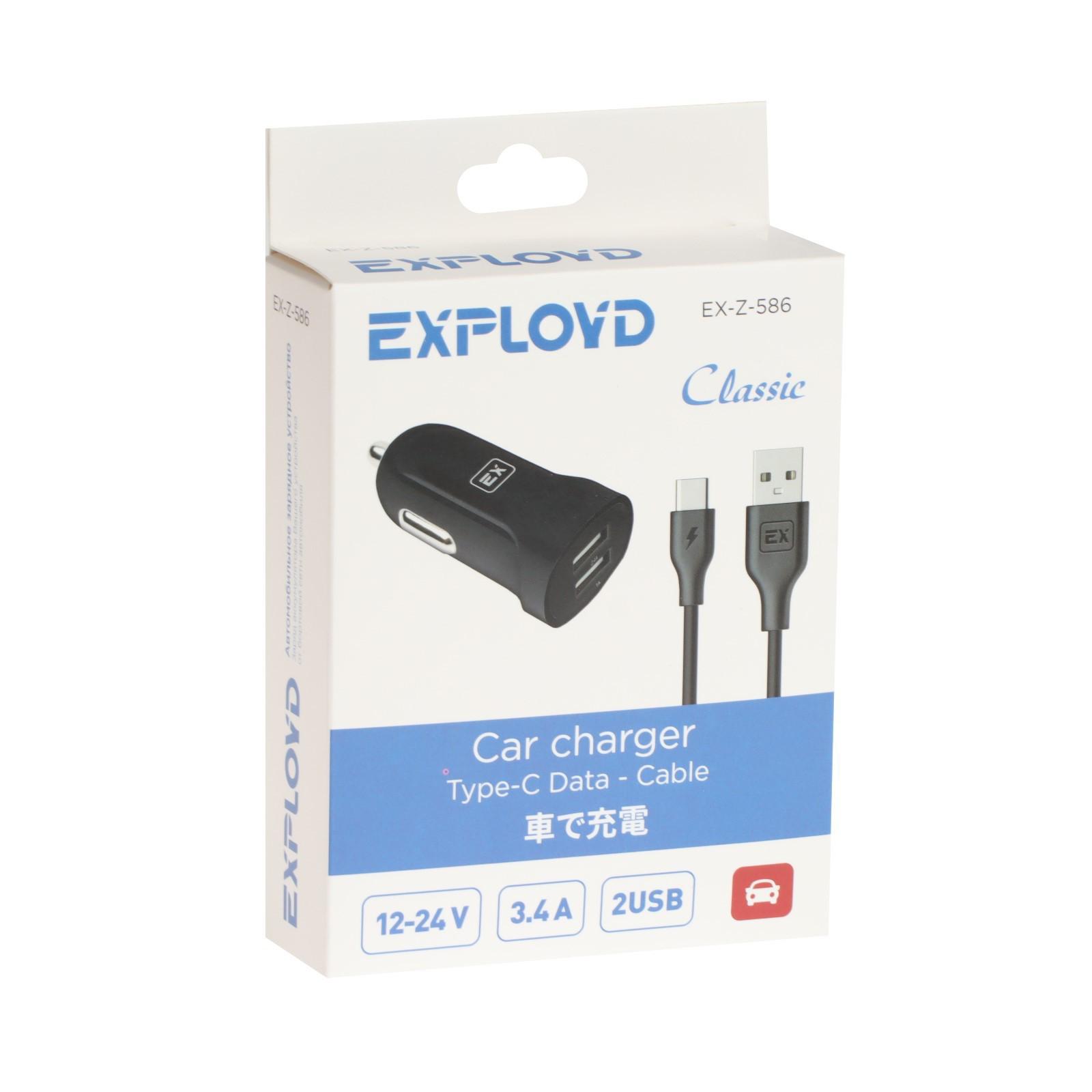 Автомобильное зарядное устройство Exployd EX-Z-586, 2 USB, 2.4А, кабель Type-C, 1м, черное