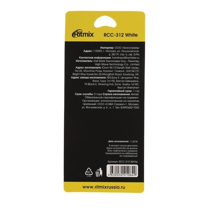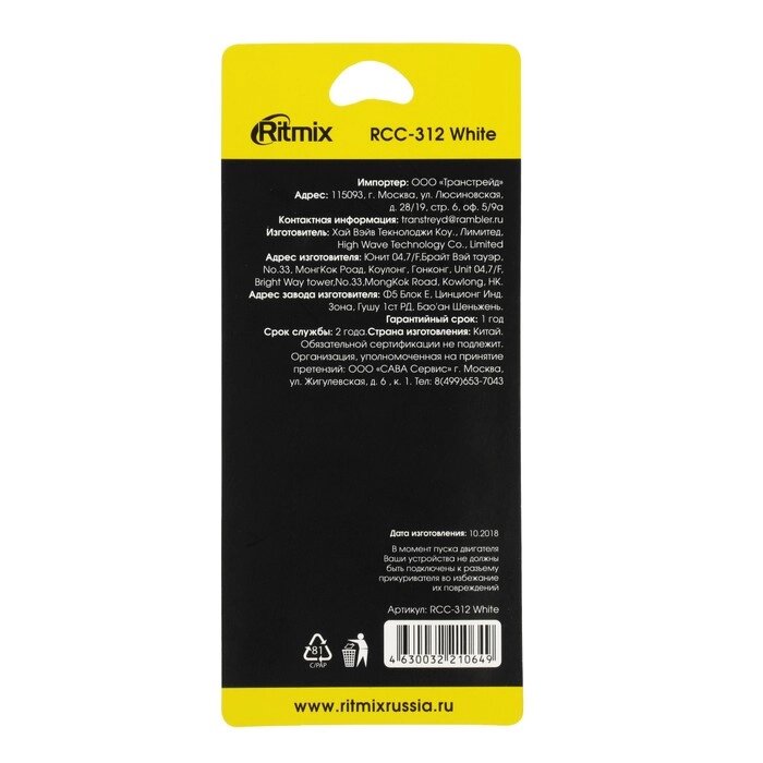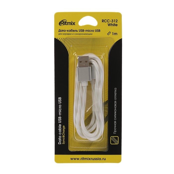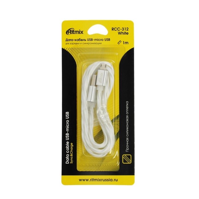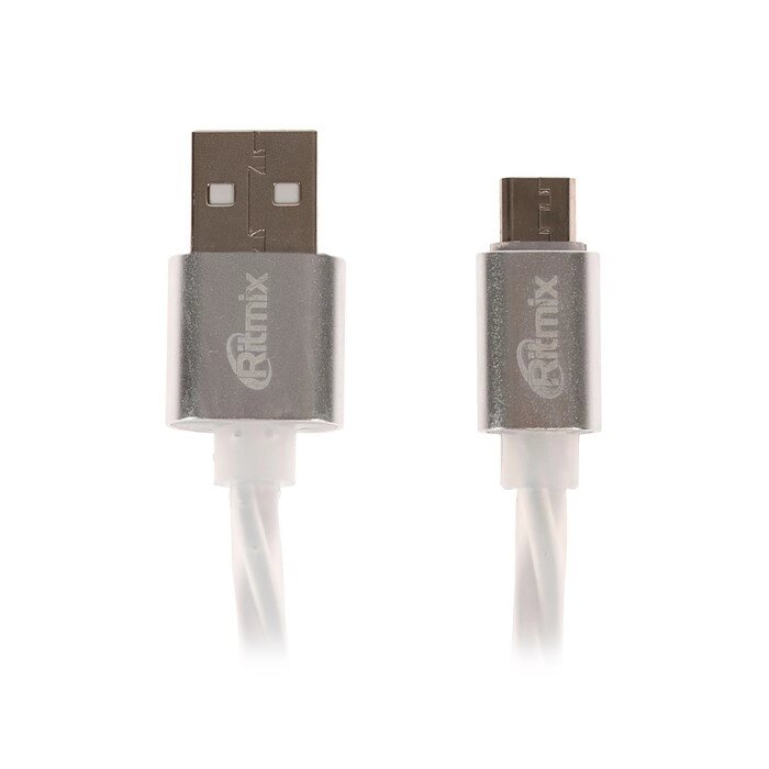 Кабель Ritmix RCC-312, microUSB-USB, 2 А, для синхр/зарядки, силиконовая оплетка,1 м, белый