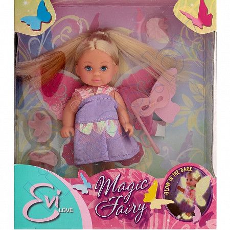 Эта милая куколка непременно понравится вашей малышке.Очаровательная куколка теперь фея. На куколке красивое платье,сзади волшебные крылышки. Одежда легко снимается. Длинные волосы куклы можно расчесывать. У куклы подвижные ручки и ножки. Благодаря своей компактности, Еви можно брать в дальнее путешествие! Кукла Еви-фея со светящимися в темноте заколкой и маской