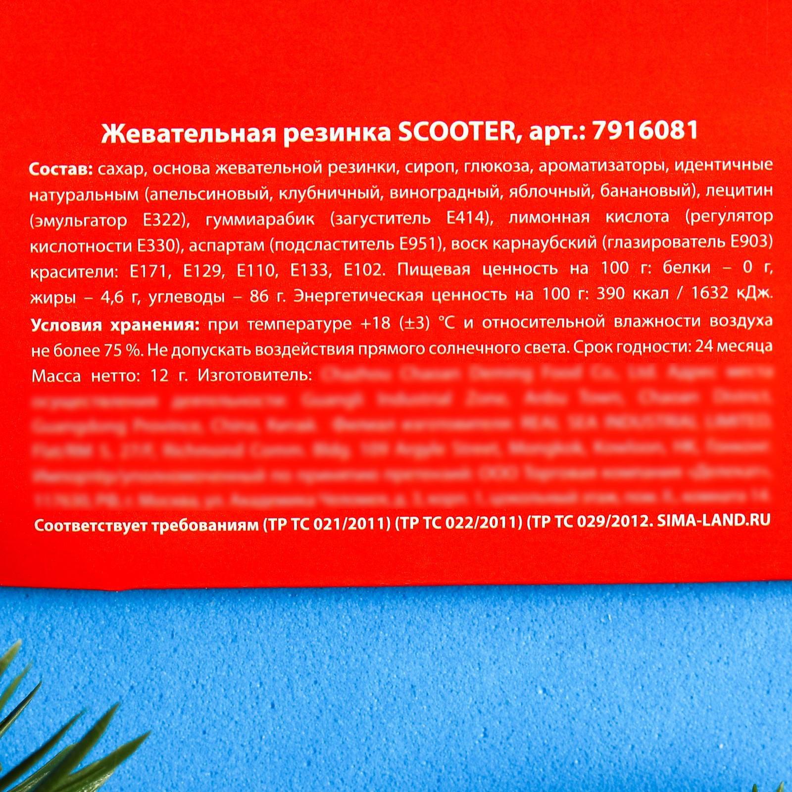 Состав: сахар, основа жевательной резинки, сироп, глюкоза, ароматизаторы, идентичные натуральным (апельсиновый, клубничный, виноградный, яблочный, банановый), лецитин (эмульгатор Е322), гуммиарабик (загуститель Е414), лимонная кислота (регулятор кислотности Е330), аспартам (подсластитель Е951), воск карнаубский (глазирователь Е903) красители: Е171, Е129, Е110, Е133, Е102.