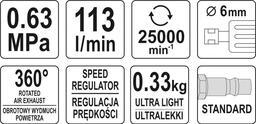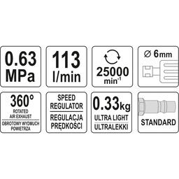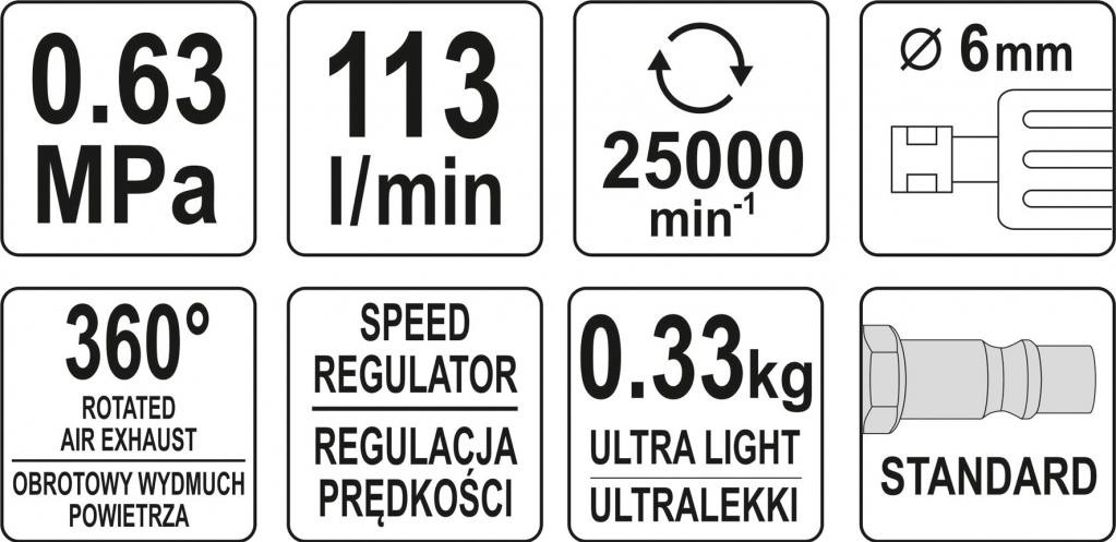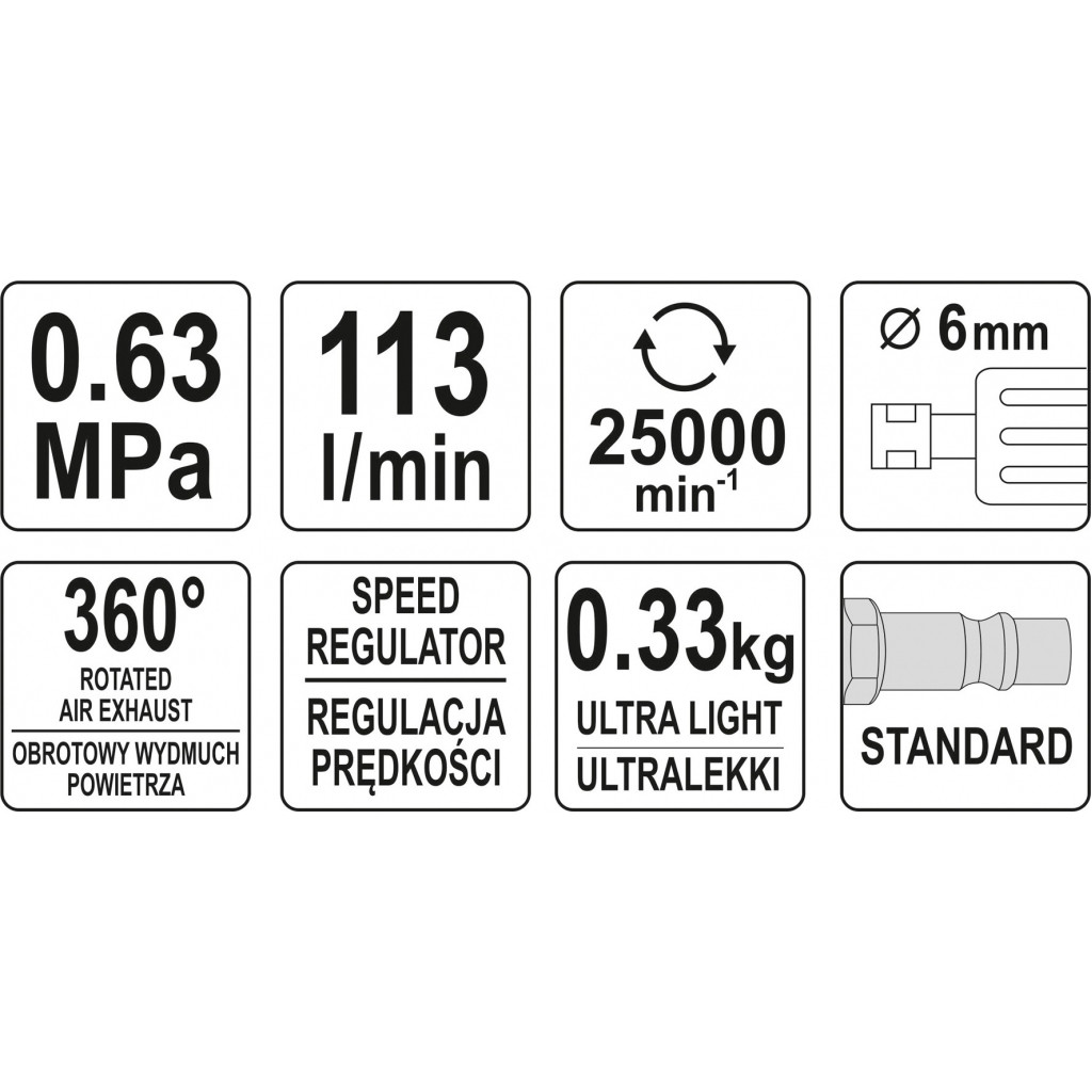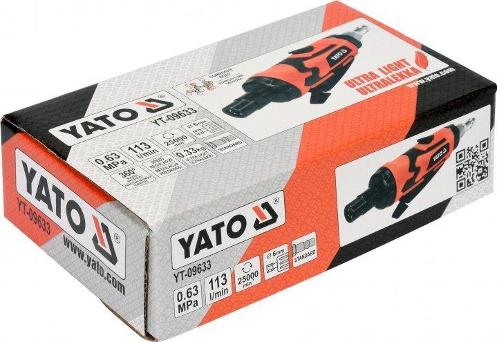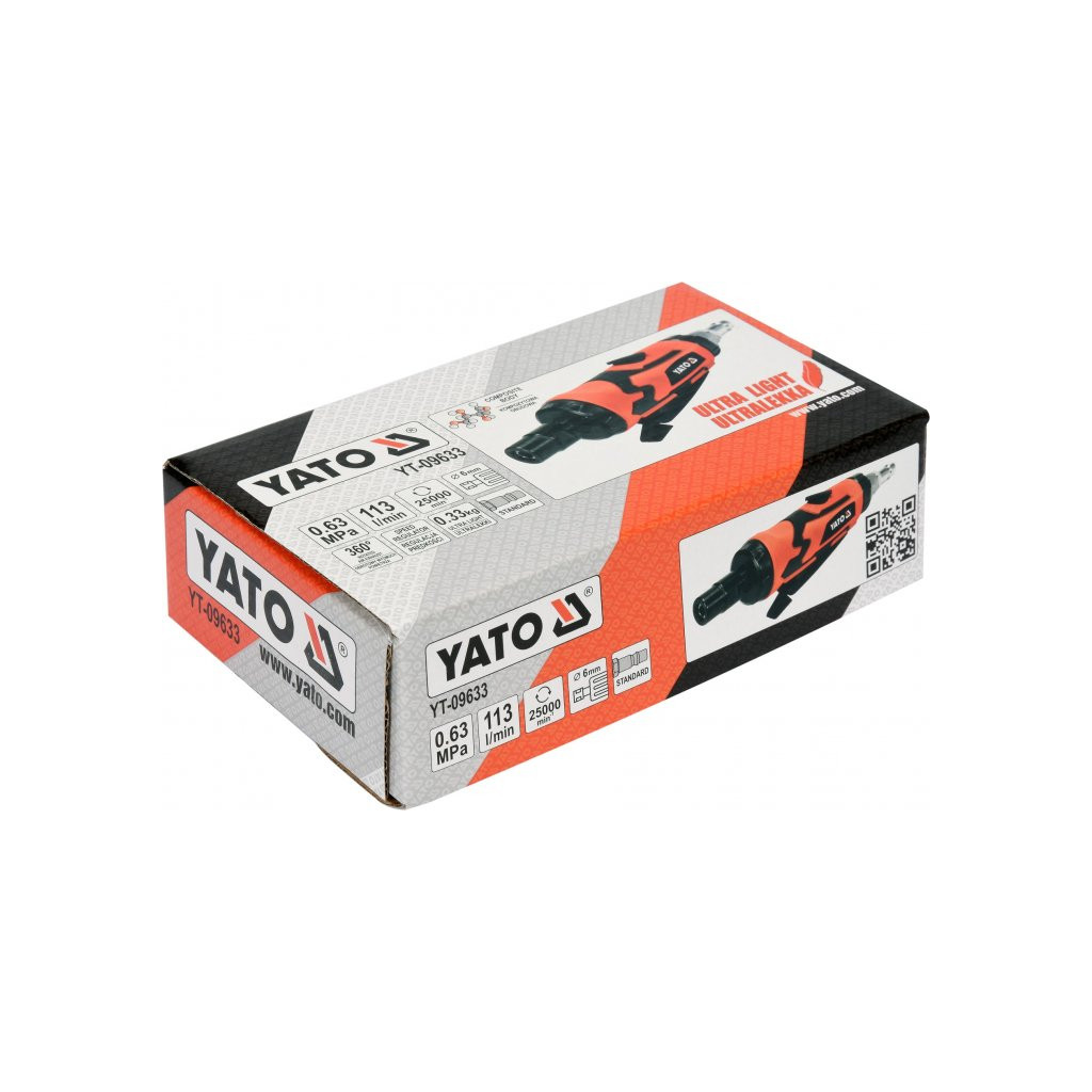 Пряма пневматична шліфмашина YATO YT-09633 живиться від струменя стиснутого повітря під тиском. Призначена для різання і шліфування різних матеріалів за допомогою відповідних дисків. Застосовується в автомобільних сервісах і в промисловості.