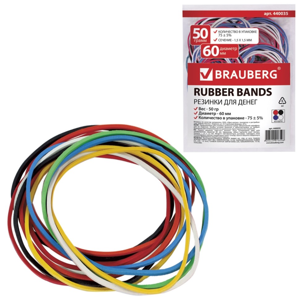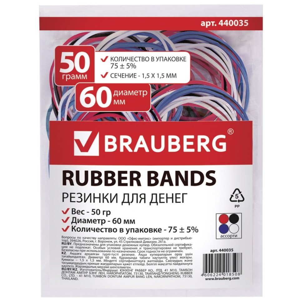 Заводская упаковка нарушена или отсутствует. Товар НОВЫЙ, в полной комплектации. / Банковские резинки BRAUBERG предназначены для упаковки денежных купюр. В упаковке - 90 шт. ± 5%. Диаметр: 60 мм. Толщина изделия: 1.5 мм. Вес: 50 г. Материал: натуральный каучук. Цвет: ассорти Бренд - BRAUBERG. Производитель - Таиланд. Артикул - 440035. Штрихкод - 4606224018508