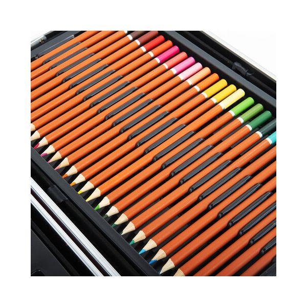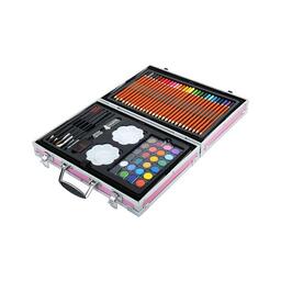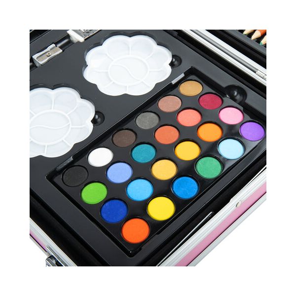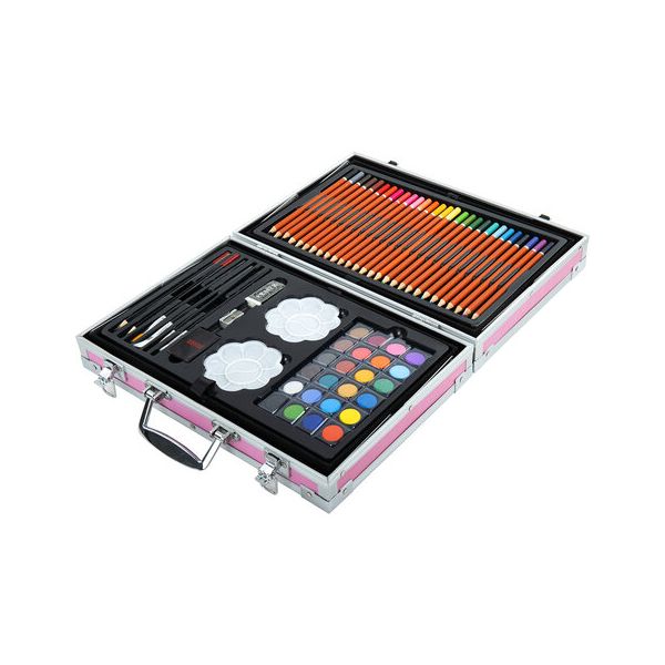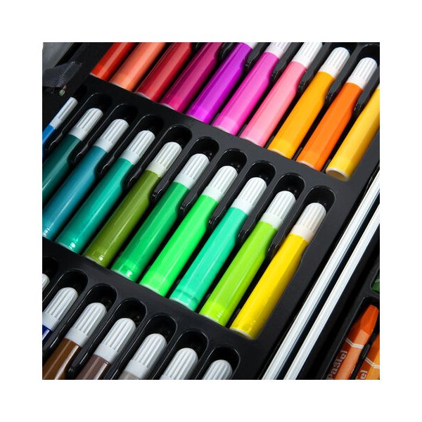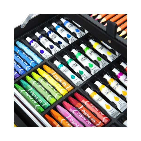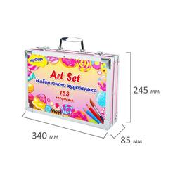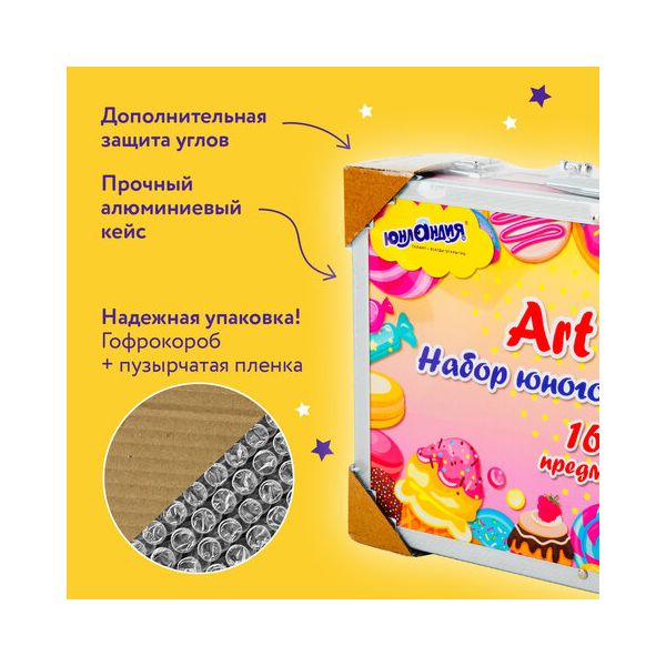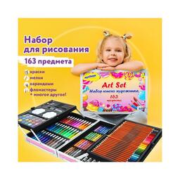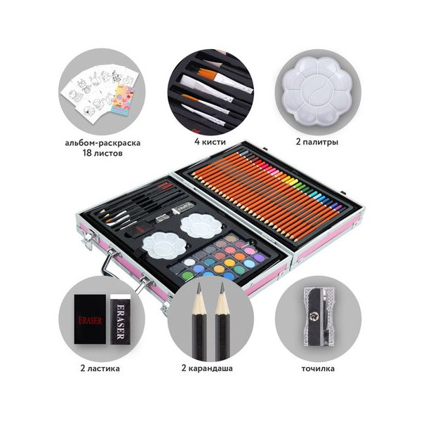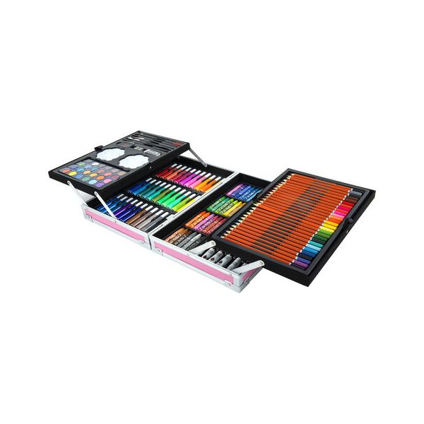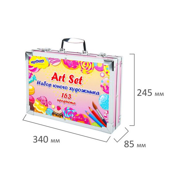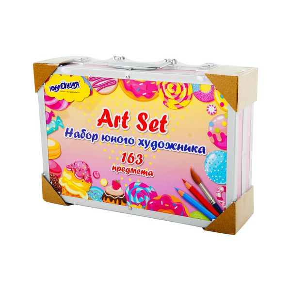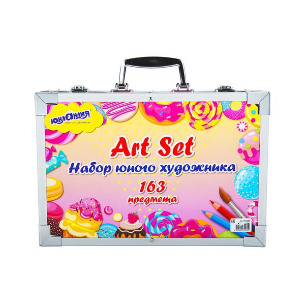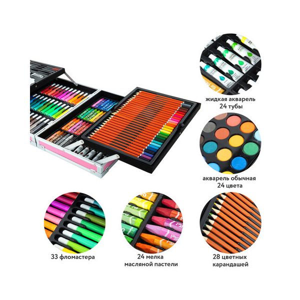 Набор представляет собой кейс с красочным дизайном и грамотно подобранным наполнением из 163 предметов. Кейс раскладывается как книга и имеет два яруса с подъемным механизмом. Каждый предмет надежно закреплен в ячейке. Прочный алюминиевый корпус кейса гарантирует полную защиту внутреннего наполнения от повреждений. Набор надежно упакован в термоусадку, воздушно-пузырчатую пленку и короб из гофрокартона. Углы кейса дополнительно защищены от повреждений при транспортировке. Набор удобно брать с собой в школу или в любые поездки. В набор входят: высококачественные цветные карандаши - 28 цветов; яркая масляная пастель - 24 цвета; удобные мини-фломастеры - 33 цвета; насыщенные акварельные краски - 24 цвета; жидкие акварельные краски в тубе - 24 цвета; чернографитные карандаши -2 штуки; кисти из синтетики разной формы и размера - 4 штуки; палитры - 2 штуки; альбом с раскрасками - 18 листов; ластики - 2 штуки; точилка - 1 штука; алюминиевый раскладывающийся кейс с красочным дизайном.
