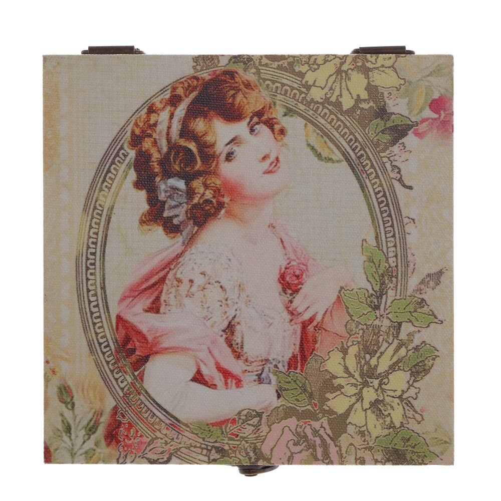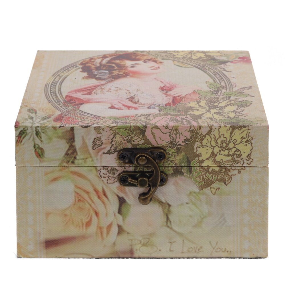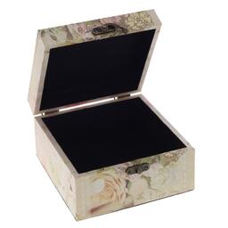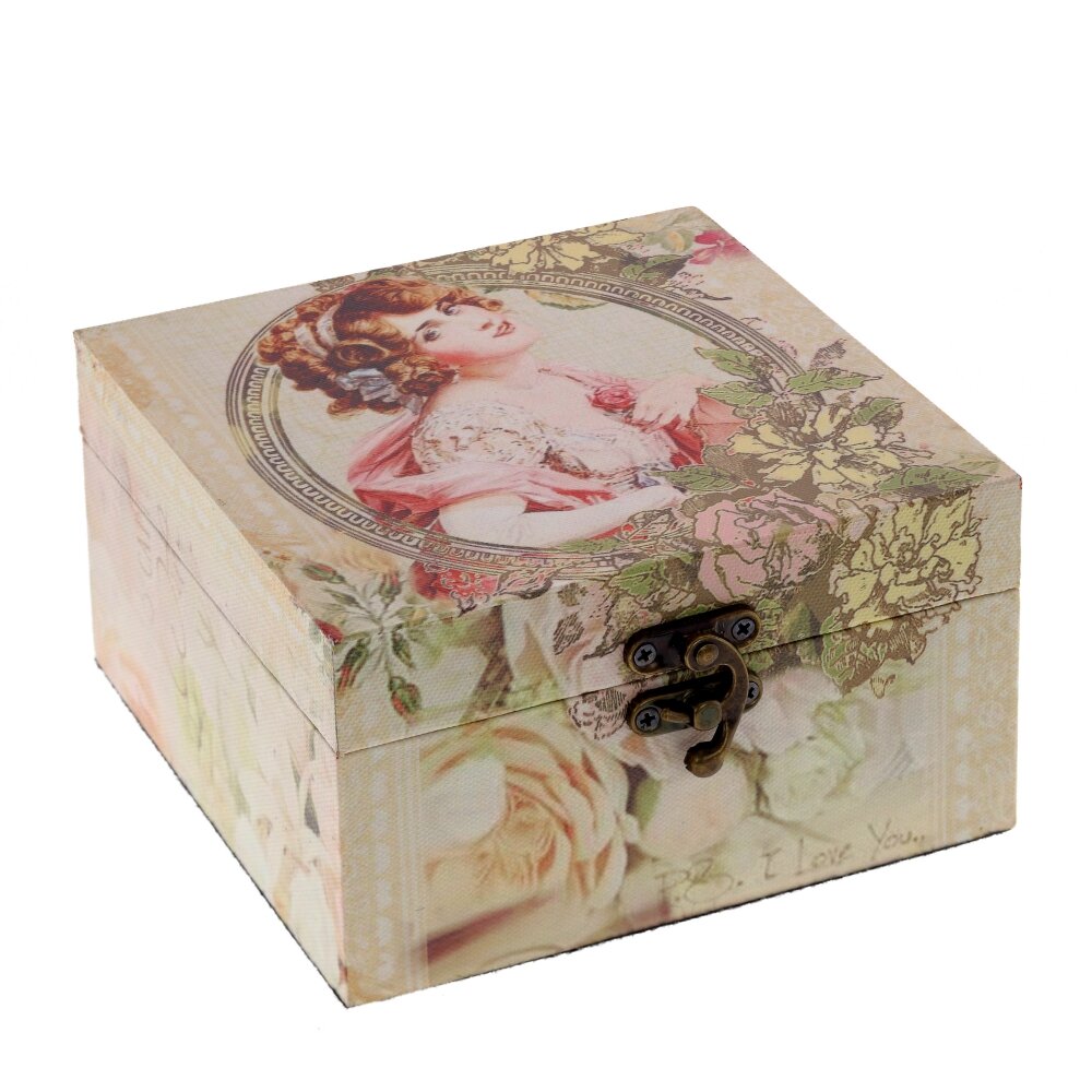 Шкатулка квадратной формы с откидной крышкой, с металлическим замком-защелкой, декорирована ярким рисунком.