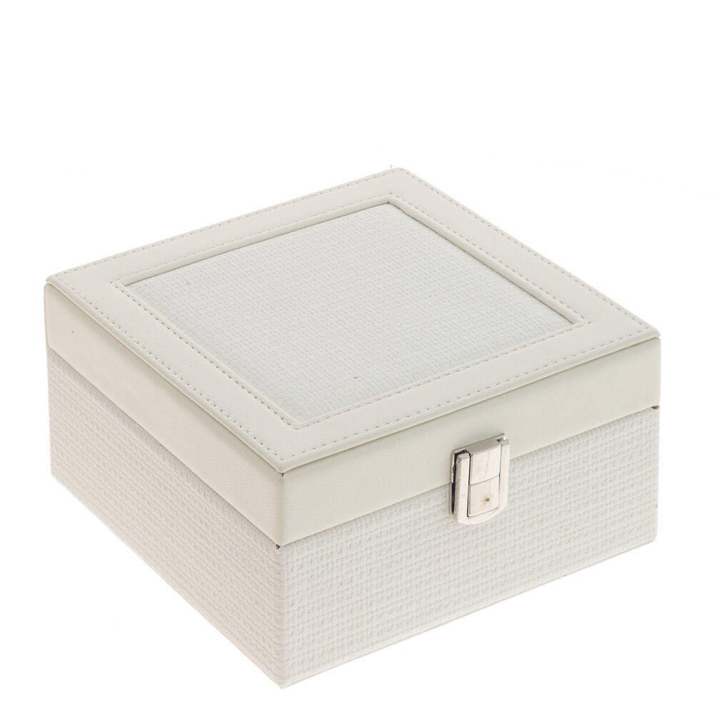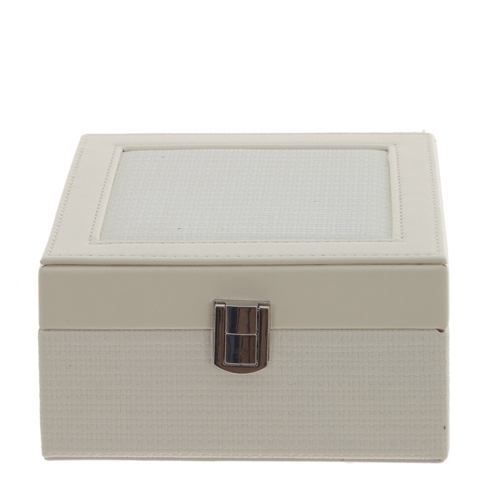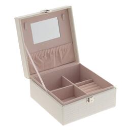 Шкатулка для украшений состоит из одного отделения, разделенного на четыре секции, одна из которых с валиками для колец. Отделка внутренней поверхности бархатистой тканью предохраняет ювелирные изделия от царапин. На внутренней стороне откидной крышки имеется зеркальце и кармашек на резинке. Закрывается шкатулка на металлическую защелку.