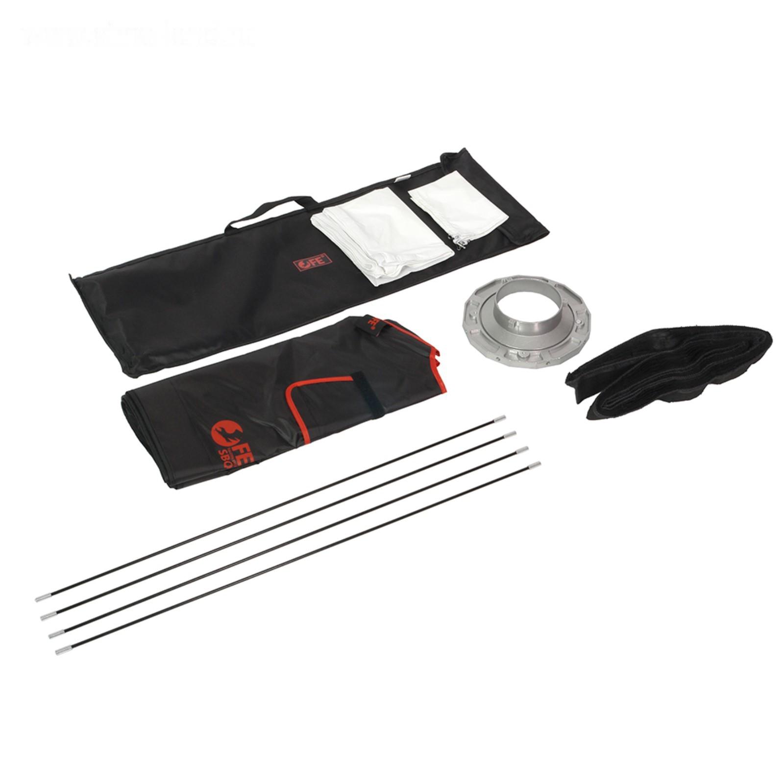 Закрытая конструкция позволяет избежать нежелательных бликов и потерь светового потока. Отражатель, с серебристой тканью внутри, обеспечивает равномерную засветку рассеивателя, который в свою очередь, благодаря большой поверхности, смягчает формируемые тени. Дополнительный внутренний диффузор улучшает равномерность светового потока. Наконечники на упругих металлических спицах не повреждают тканевые спицедержатели софтбокса и облегчают сборку конструкции.