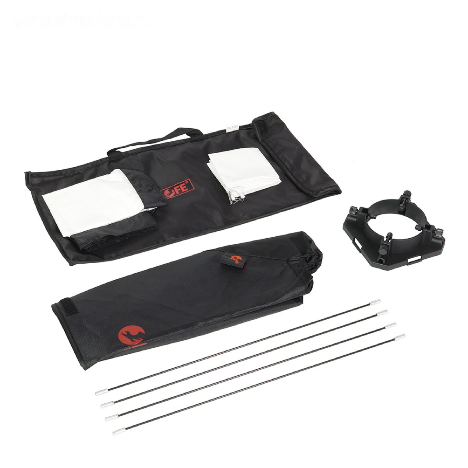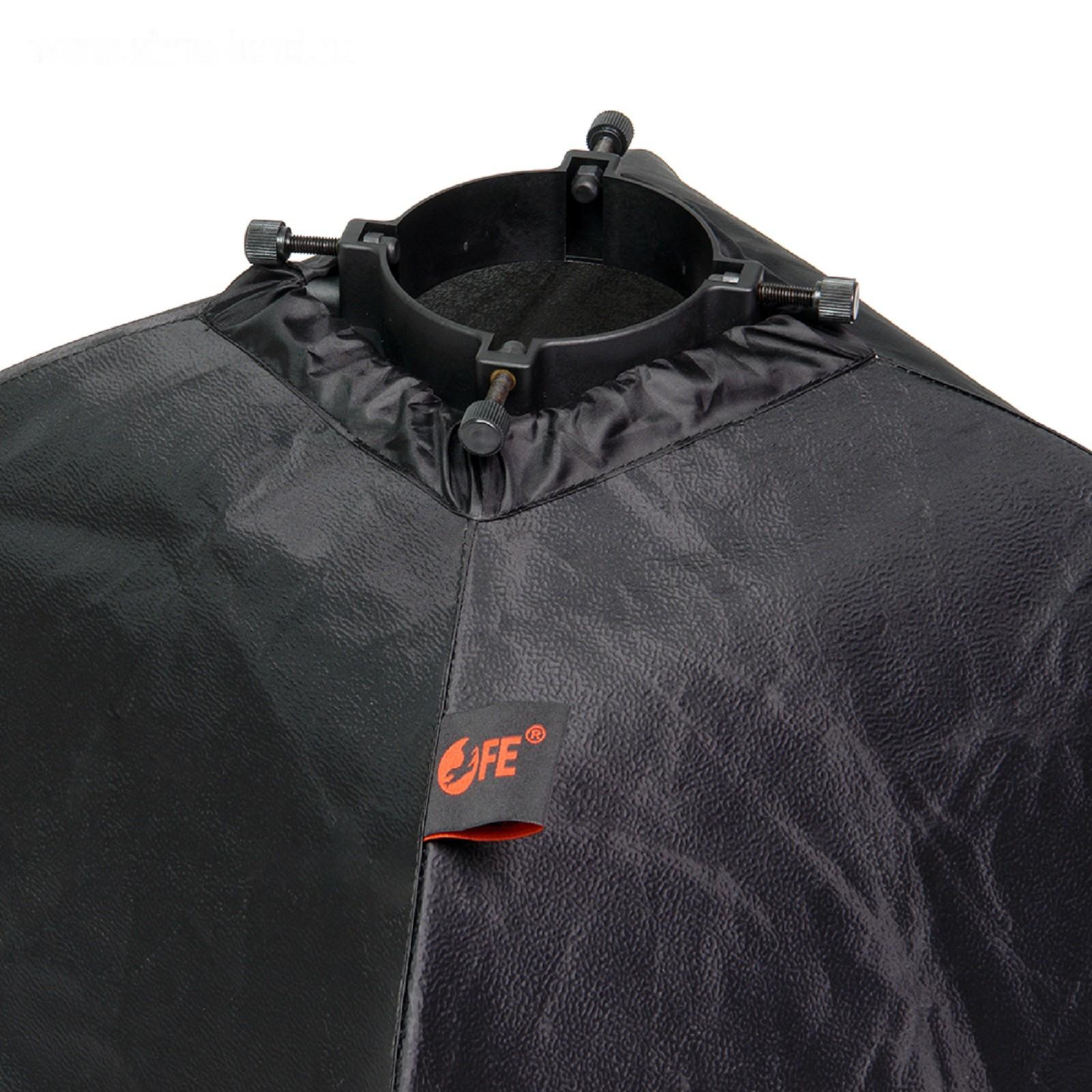 Закрытая конструкция позволяет избежать нежелательных бликов и потерь светового потока. Отражатель, с серебристой тканью внутри, обеспечивает равномерную засветку рассеивателя, который в свою очередь, благодаря большой поверхности, смягчает формируемые тени. Дополнительный внутренний диффузор улучшает равномерность светового потока. Наконечники на упругих металлических спицах не повреждают тканевые спицедержатели софтбокса и облегчают сборку конструкции.
