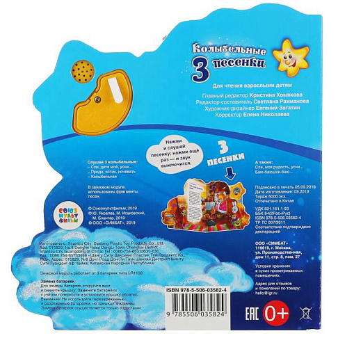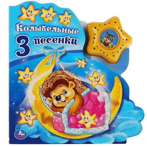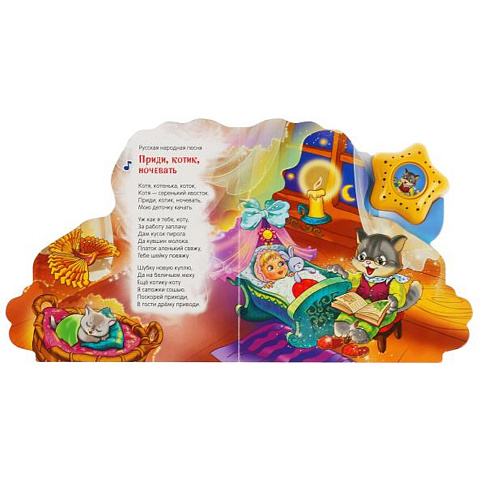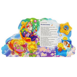 Ребенок с удовольствием будет листать плотные страницы с яркими картинками. Эта добрая и увлекательная книжка для малышей с особенным сюрпризом-изюминкой: стоит ребёнку нажать на кнопку-звездочку, и он услышит колыбельные песенки, а звездочка загорится огоньками. Благодаря компактному формату книгу удобно взять с собой в дорогу.