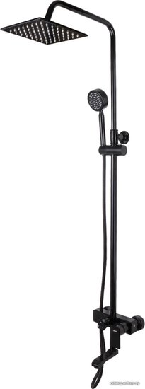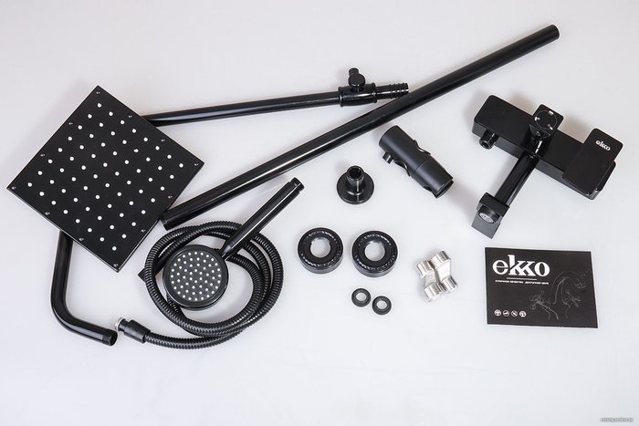 - Комплектация верхний душ, штанга, ручной душ (лейка), держатель лейки, шланг, смеситель, излив для ванны