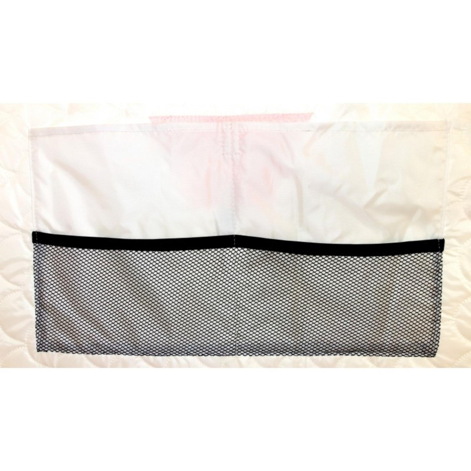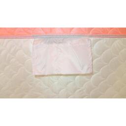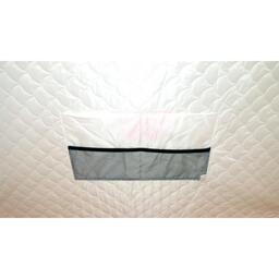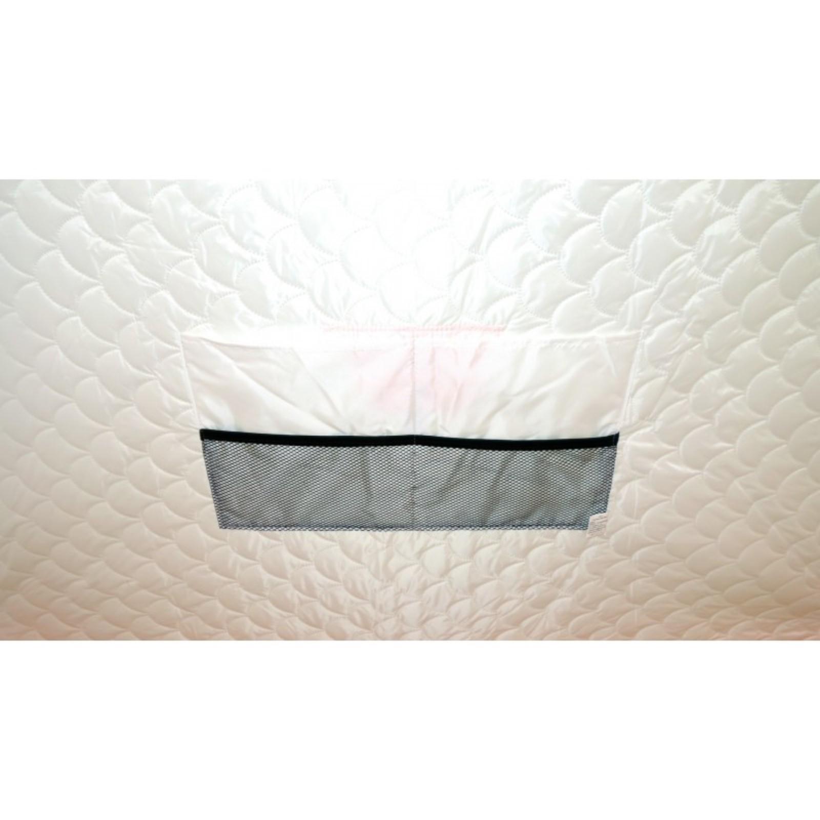 В тенте имеется форточка в виде молнии на крыше, два кармана в верхней части тента под снасти и два сдвоенных кармана с сеткой в нижней части тента. Основной цвет белый с цветной крышей, порогами и дверью, снаружи имеются светоотражающие элементы, что очень важно для безопасности на льду в темное время суток. Удобный фирменный чехол позволяет свободно уложить после рыбалки даже обмерзшую палатку!