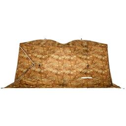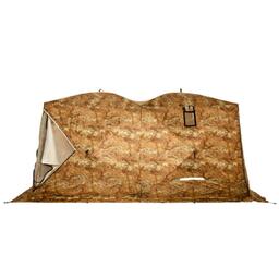 Всесезонная палатка "BIG TWIN" (2-сл.)! Имеет форму двойного куба, что позволяет организовать базовый лагерь от 4-х человек и при этом рационально использовать пространство. "Big Twin" - это не только укрытие для рыбаков. Благодаря конструкции, одна из сторон поднимается и становится крышей, тем самым модифицируя палатку в шатер. Летом, установив палатку на берегу водоема, вы находитесь в укрытии и в то же время имеете открытый доступ к воде и абсолютно свободно работаете со снастями. В то же время вещи, прикормка, насадка, снасти - всё находится рядом в укрытии. Размеры "Big Twin" позволяют комфортно расположить вещи и с удобством разместиться самим. Зимой сверлить лунки можно непосредственно в установленной палатке. Несмотря на свои размеры, палатка выдерживает порывистый ветер. Легко ставится в любую погоду. Для удобства в палатке также сделано два входа. Входы сделаны напротив друг друга, что позволяет оптимизировать внутреннее пространство (при этом открывающая сторона находится напротив дверей). Входы с фиксатором – липучкой выполнены в угловом варианте и снабжены специальной зимней молнией, которая снаружи имеет защитную планку, предотвращающую от замерзания. На наружной юбке имеются оттяжки для крепления порогов при отсутствии снега. Тент кроме поднимающейся стороны и двух входов имеет: 3 форточки, выполненных из прозрачной морозостойкой ПВХ-плёнки (одна полностью съёмная), 4 настрочных кармана с сеткой, 4 потолочных кармана-сетки, выход под трубу на липе. Основной цвет белый с цветной крышей и порогами. Снаружи имеются светоотражающие элементы, что очень важно для безопасности на льду в темное время суток.