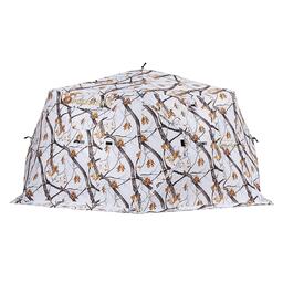 Утепленная трапециевидная зимняя палатка шестигранной формы. Выполнена в зимнем камуфляже.