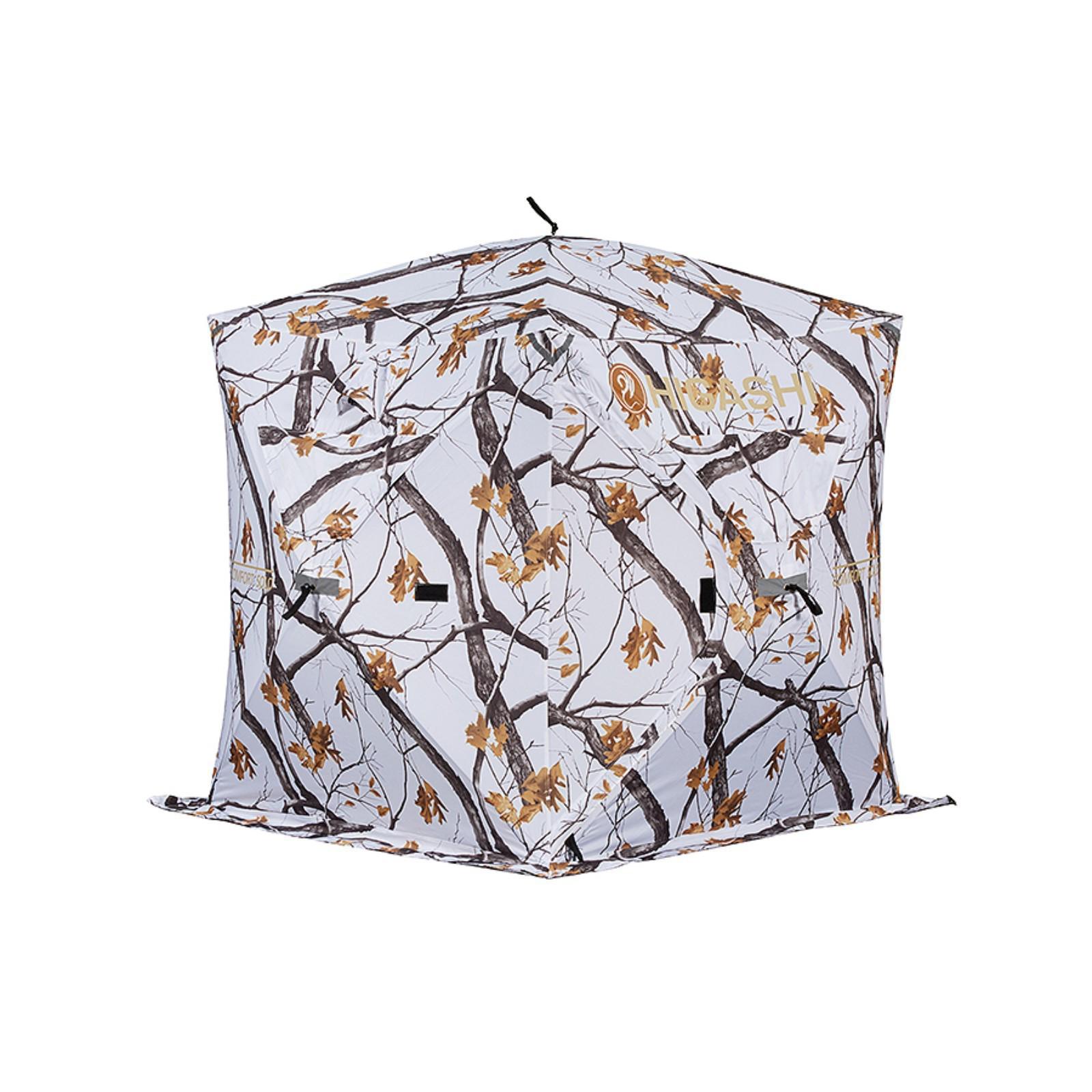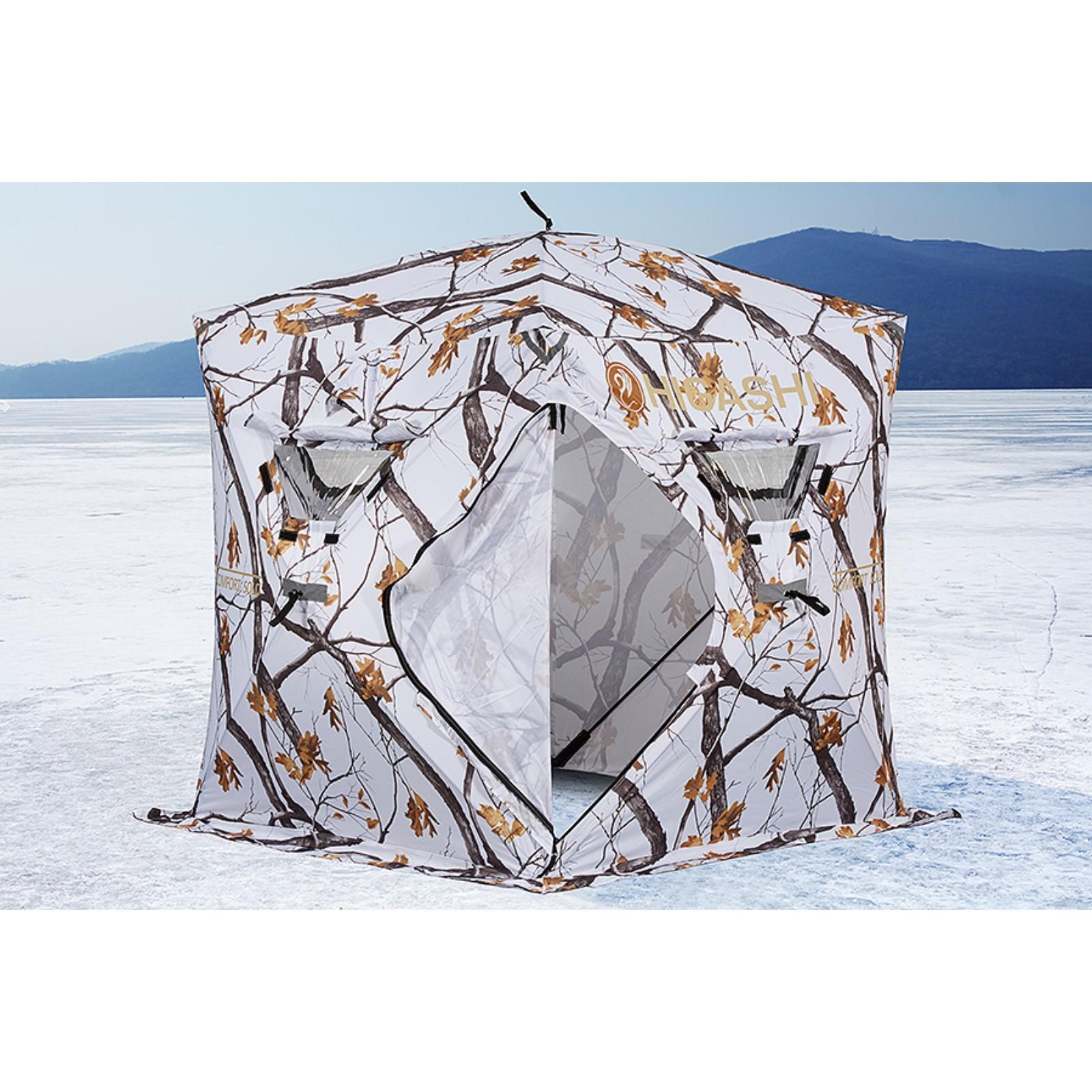 Зимняя палатка традиционной кубовидной формы, имеет наиболее компактные размеры, идеальна для одиночной рыбалки со льда. Выполнена в зимнем камуфляже.