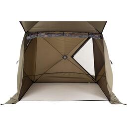 За 30 секунд, путем открытия двух молний, одна сторона палатки поднимается и становится крышей. Палатка превращается в укрытие для летней рыбалки или просто шатром. Установив палатку на берегу водоема, Вы находитесь в укрытии и в то же время имеете открытый доступ к воде и абсолютно свободно работаете со снастями. В то же время вещи, прикормка, насадка, снасти - всё находится рядом в укрытии.