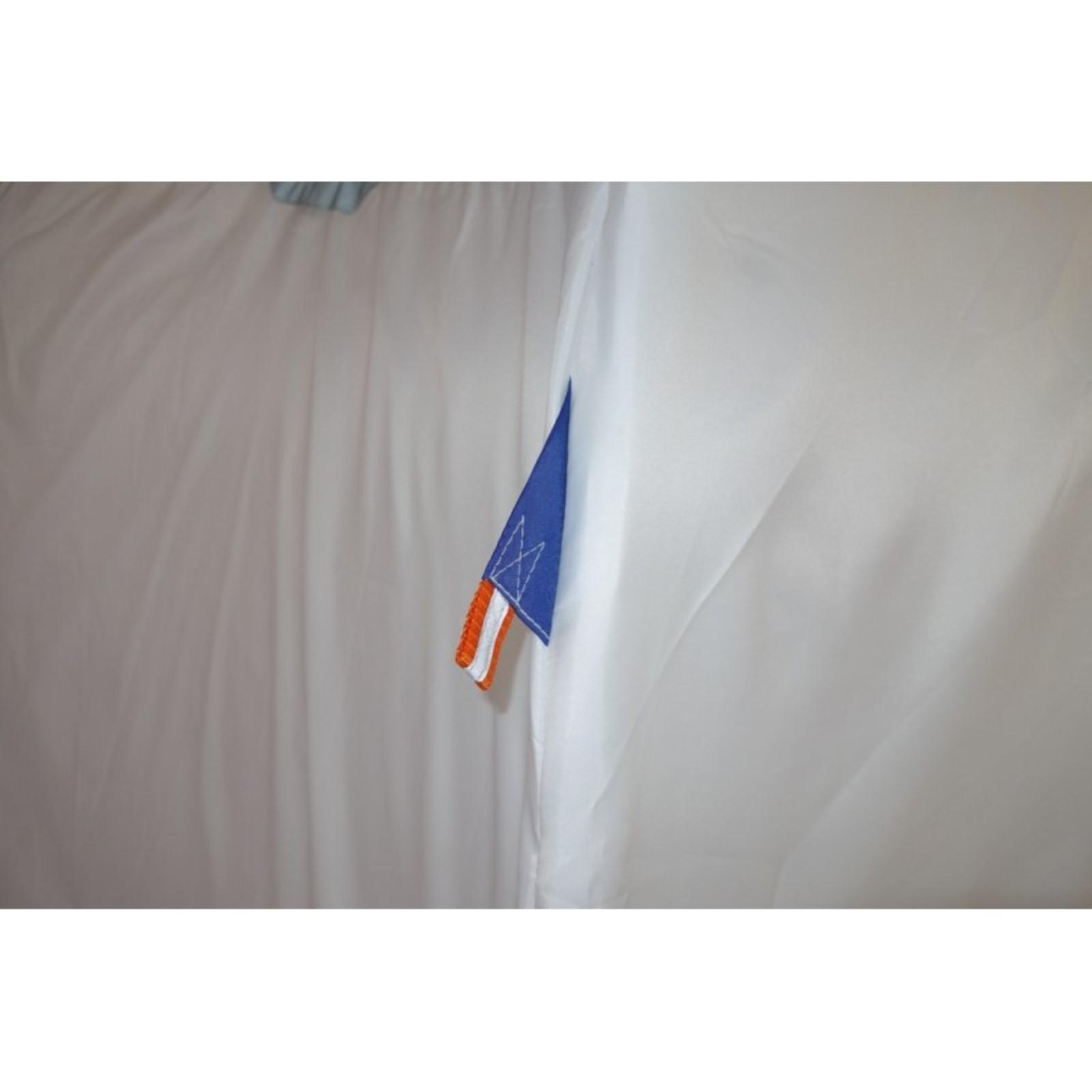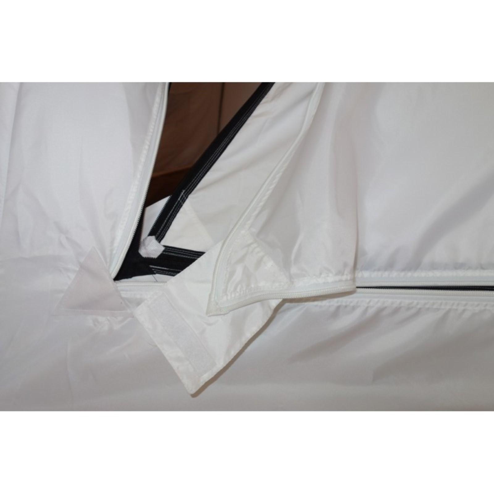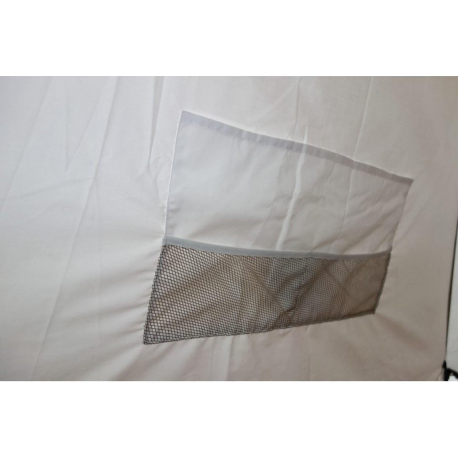 Основной цвет белый с цветной крышей, снаружи имеются светоотражающие элементы, что очень важно для безопасности на льду в темное время суток. Удобный фирменный чехол позволяет свободно уложить после рыбалки даже обмерзшую палатку! Также мы рекомендуем укрепить палатку растяжками, независимо от наличия ветра.