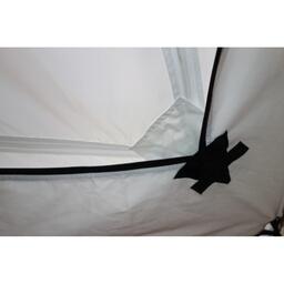 В палатке имеется форточка в виде молнии на крыше, два кармана в верхней части тента под снасти и два сдвоенных кармана с сеткой в нижней части тента. Устойчивый каркас, двойной слой и достаточный объем позволяет комфортно находиться в такой палатке длительное время. В такой палатке можно свободно разместить и удобное рыболовное кресло и раскладушку 195 см, и многочисленные вещи и снасти, а ширина палатки позволяет оборудовать три/четыре лунки.
