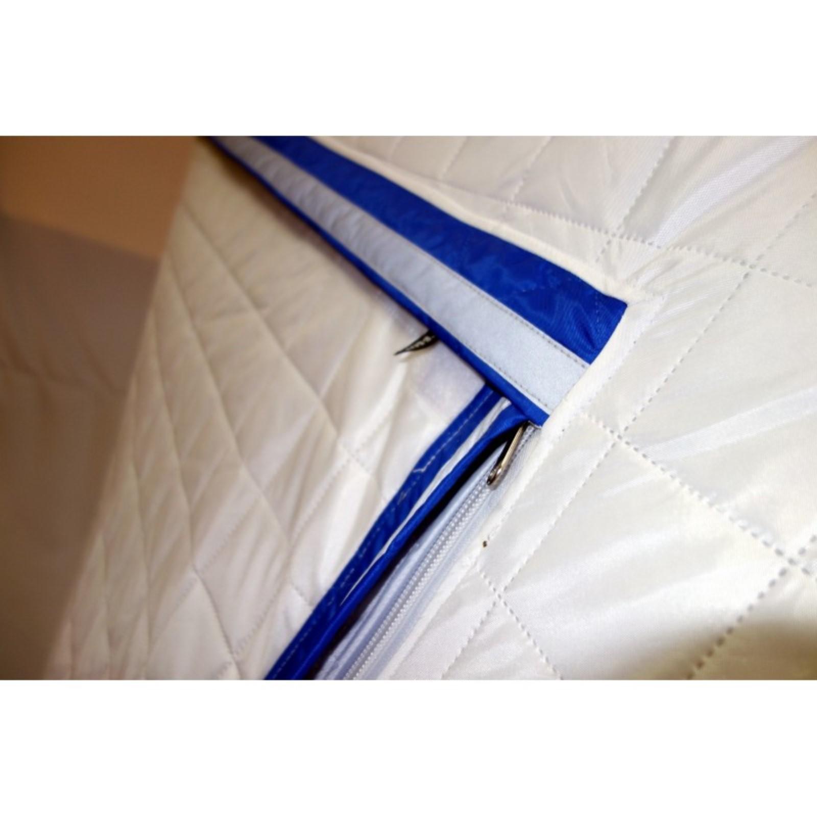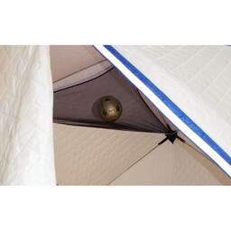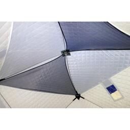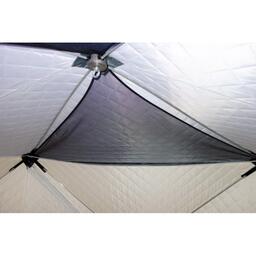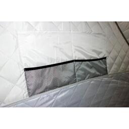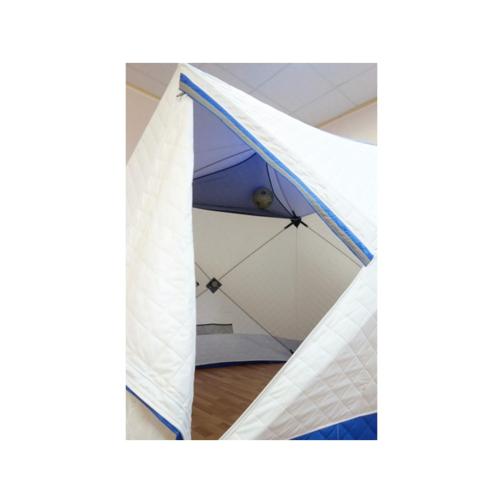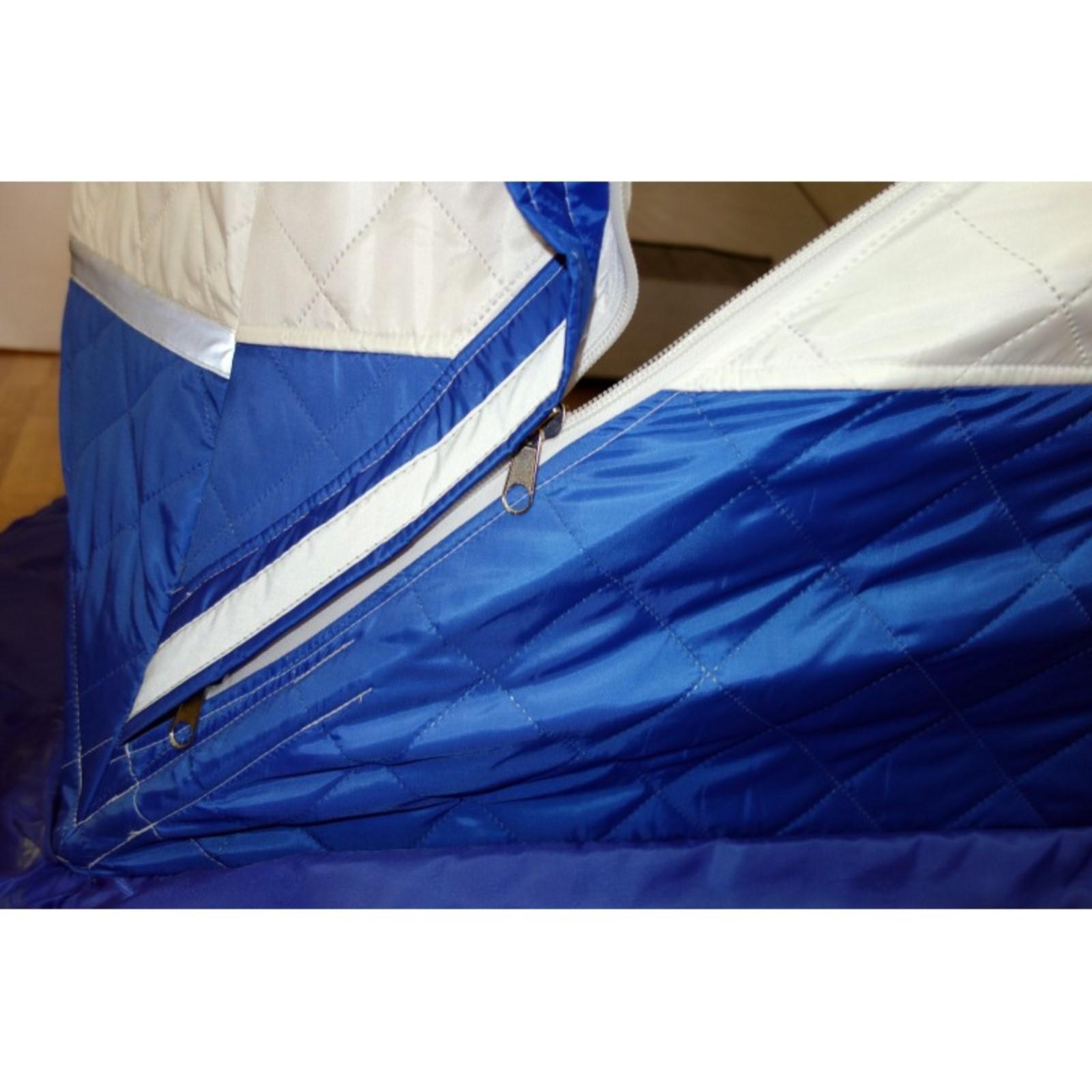Теперь в ней могут свободно разместиться четыре человека и комфортно рыбачить как днем, так и ночью! Для удобства сделано два входа. Входы сделаны не по диагонали, как принято на всех импортных аналогах, а напротив друг друга, что позволило оптимизировать внутреннее пространство. Входы выполнены в угловом варианте и снабжены застежкой – липучкой. Так же входы снабжены специальной зимней молнией, которая снаружи имеет защитную планку, предотвращающую от замерзания.