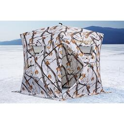 Утепленная зимняя палатка традиционной кубовидной формы выполненная в зимнем камуфляже.