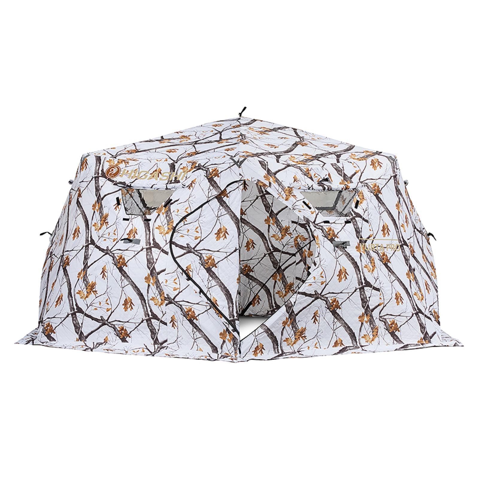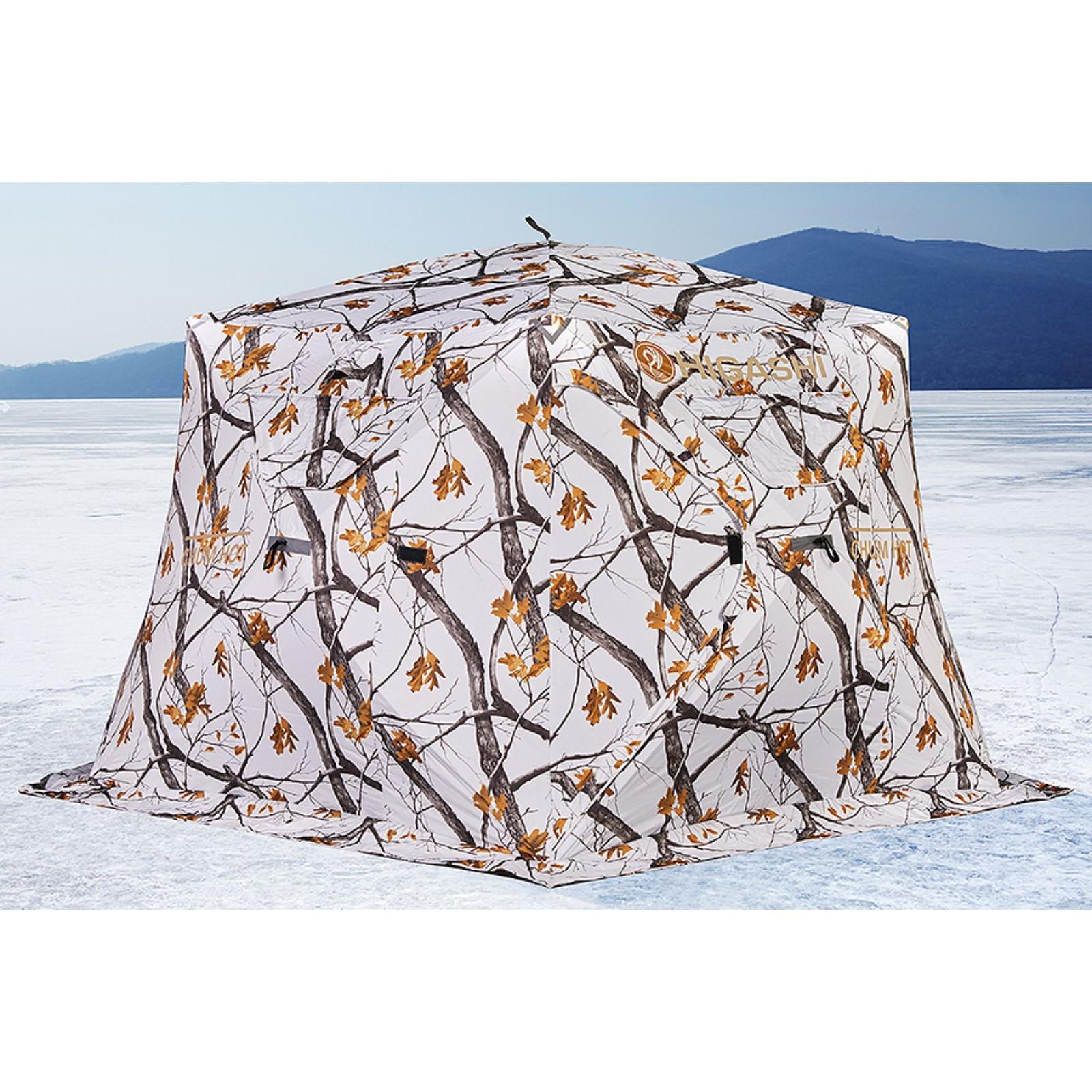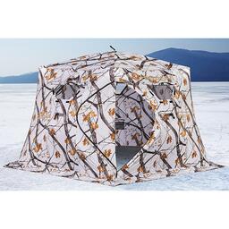 Утепленная трапециевидная зимняя палатка шестигранной формы. Выполнена в зимнем камуфляже. Ткань типа сэндвич, не имеет мостиков холода, поэтому подойдёт для более холодных регионов, для длительного нахождения в ней с печкой.
