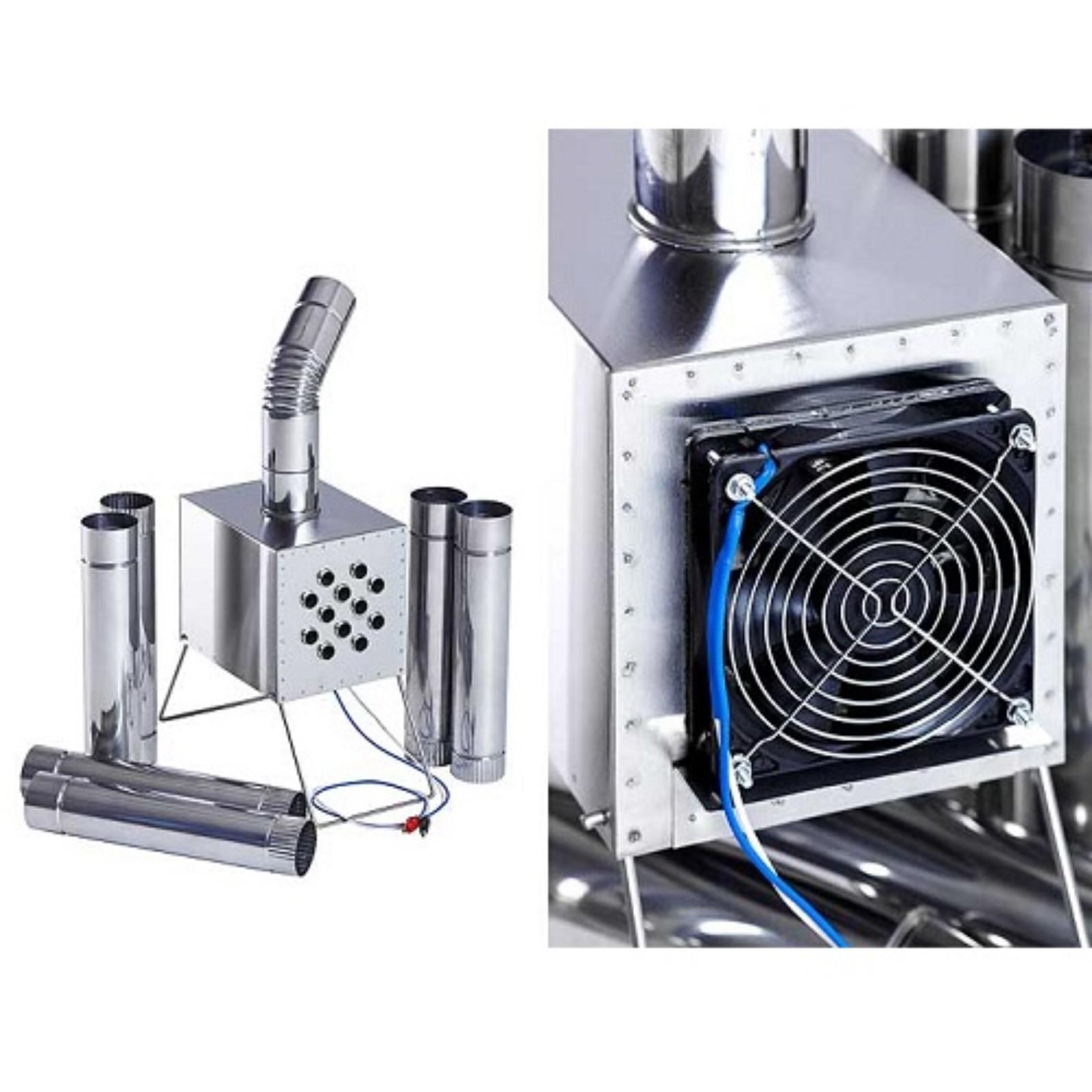 Теплообменник из нерж. стали - предназначен для обогрева помещений (зимних палаток) при помощи горелки любого типа или походной газовой плитки мощностью до 2,4кВт. Циркуляция нагреваемого воздуха осуществляется за счет вентилятора напряжением 12В. Пример: палатка 3х3х2м. при наружной температуре -15 град. разогревается до 25 град. за 15 минут. При эксплуатации устройства, угарный газ отводится через дымоходную трубу за счёт естественной тяги.