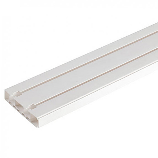 Потолочный карниз СБ-060-2Л/300. Конструкция состоит из двух прямых рядов длиной 3 метра. Карниз изготовлен из ПВХ и характеризуется высокой прочностью. Предназначен для монтажа на потолок с целью крепления штор, а также декора жилых и офисных помещений. Цвет белый.