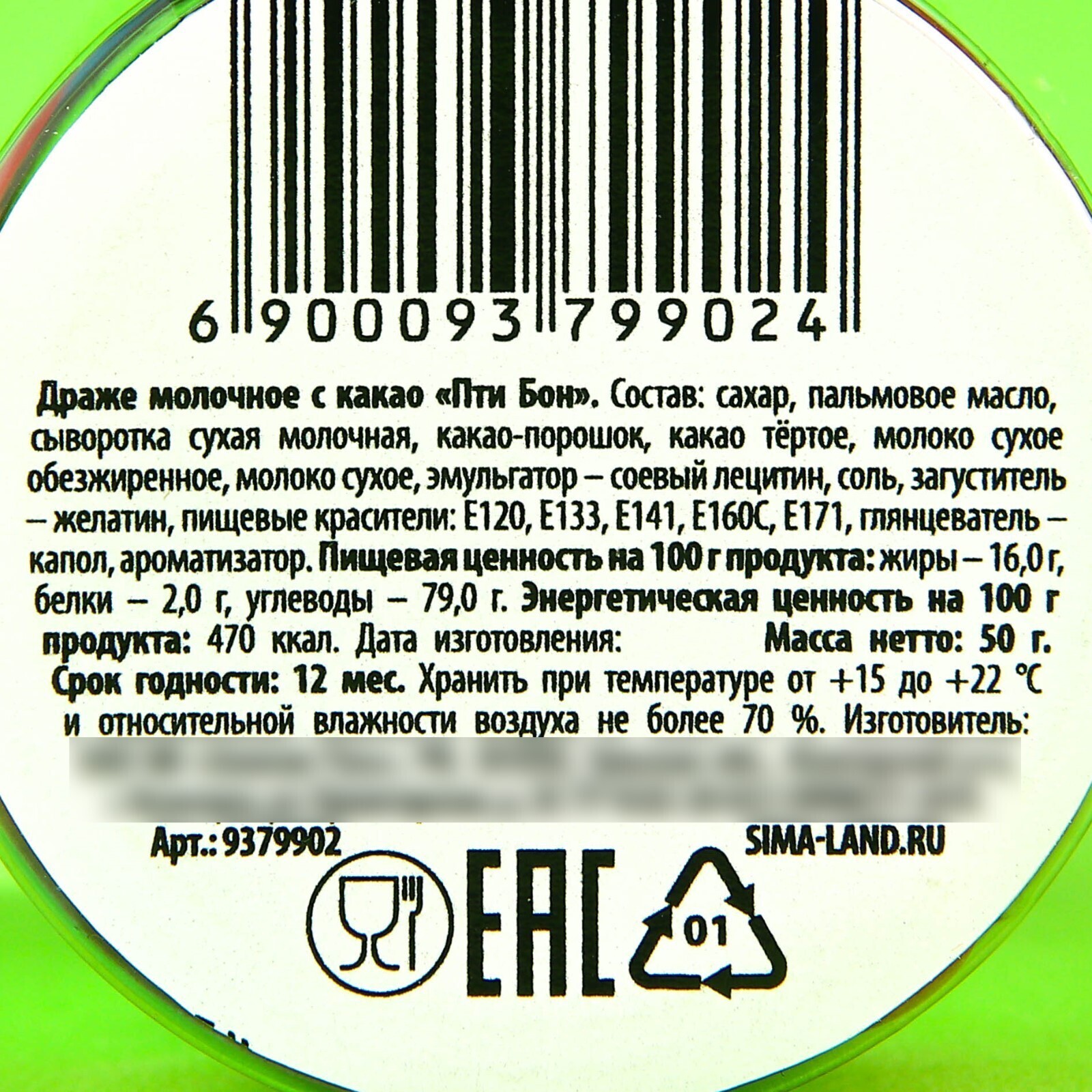 Состав: сахар, пальмовое масло, сыворотка сухая молочная, какао-порошок, какао тёртое, молоко сухое обезжиренное, молоко сухое, эмульгатор – соевый лецитин, соль, загуститель – желатин, пищевые красители: Е120, Е133, Е141, Е160С, Е171, глянцеватель – капол, ароматизатор.