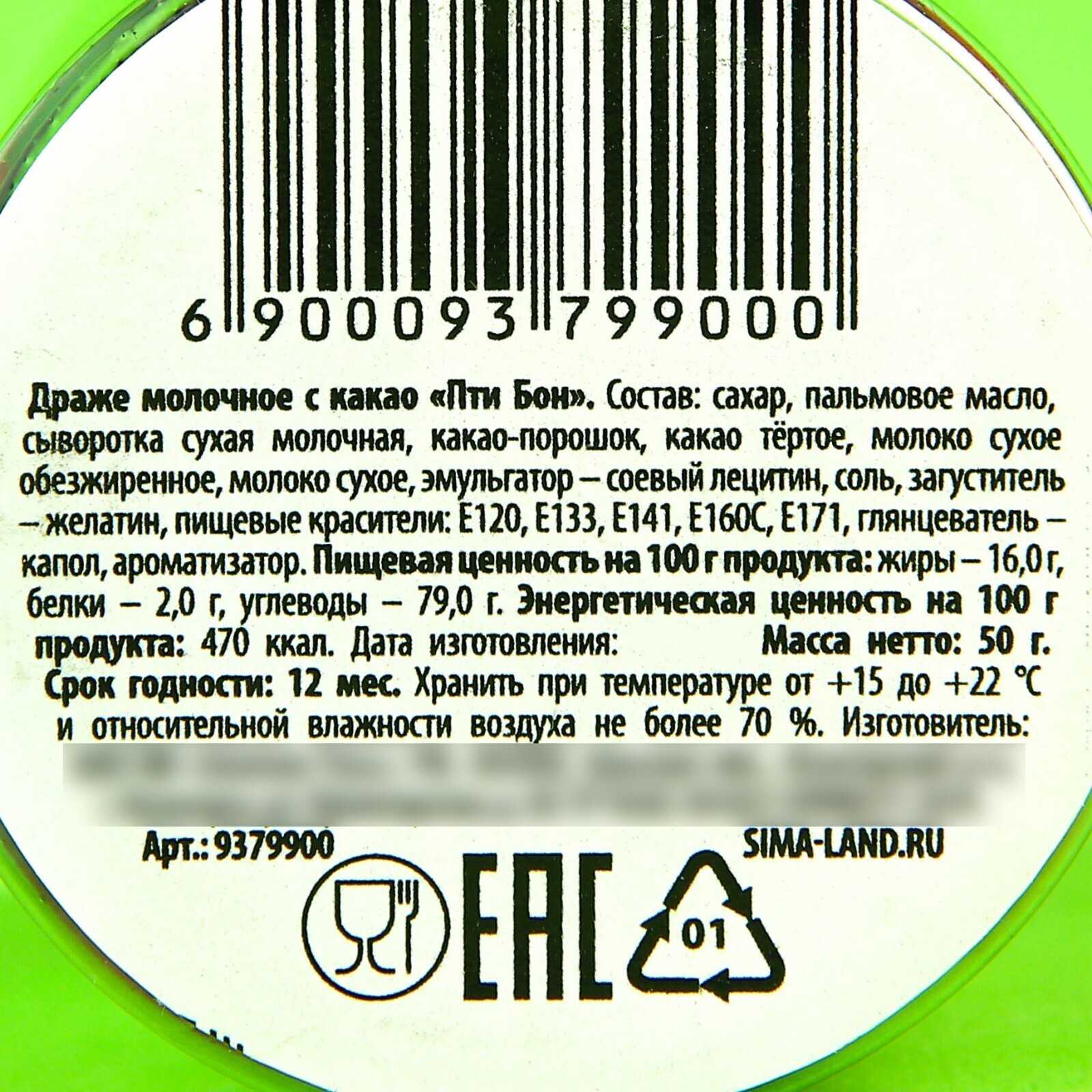 Состав: сахар, пальмовое масло, сыворотка сухая молочная, какао-порошок, какао тёртое, молоко сухое обезжиренное, молоко сухое, эмульгатор – соевый лецитин, соль, загуститель – желатин, пищевые красители: Е120, Е133, Е141, Е160С, Е171, глянцеватель – капол, ароматизатор.