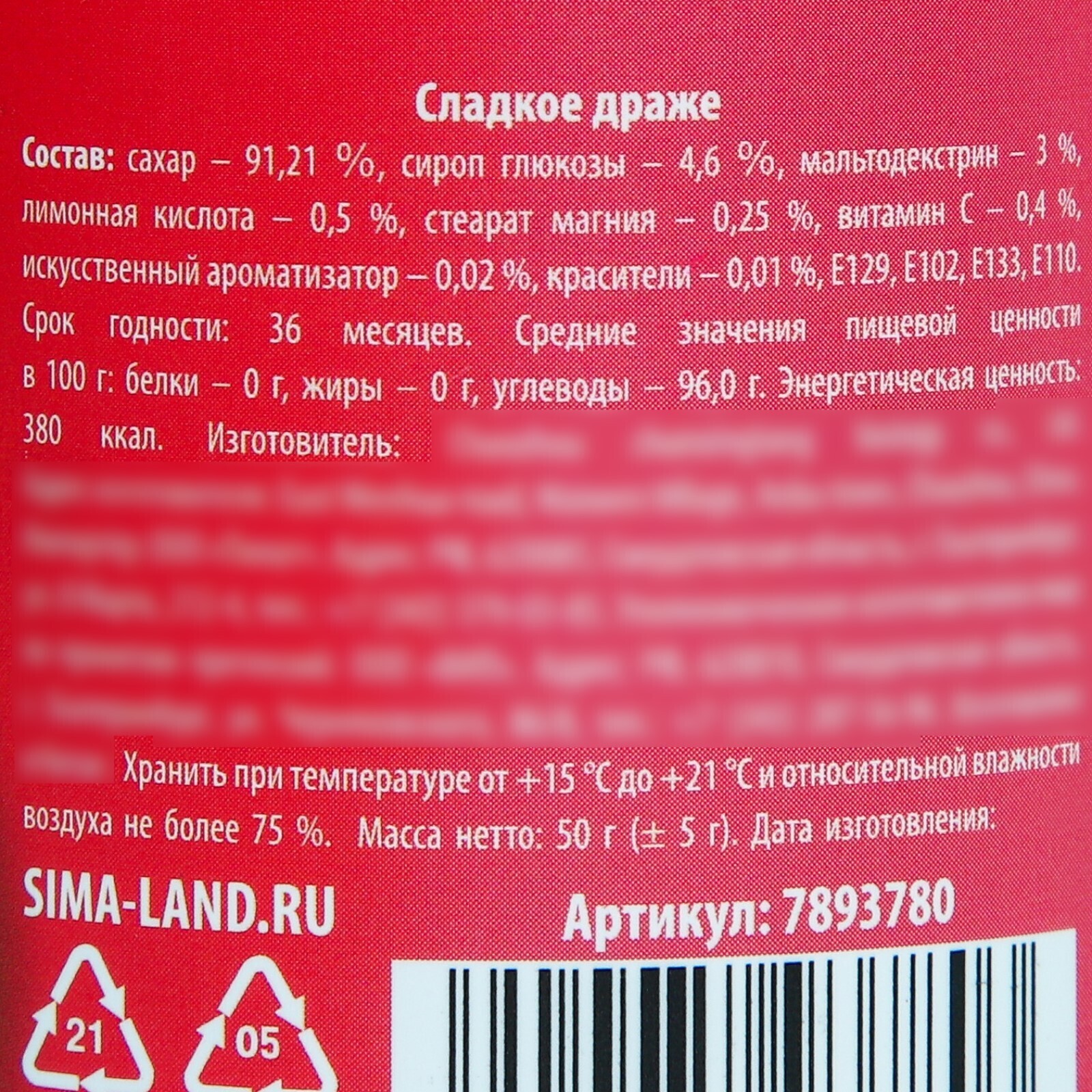 Состав: сахар – 91,21 %, сироп глюкозы – 4,6 %, мальтодекстрин – 3 %, лимонная кислота – 0,5 %, стеарат магния – 0,25 %, витамин C – 0,4 %, искусственный ароматизатор – 0,02 %, красители – 0,01 %, E129, E102, E133, E110.