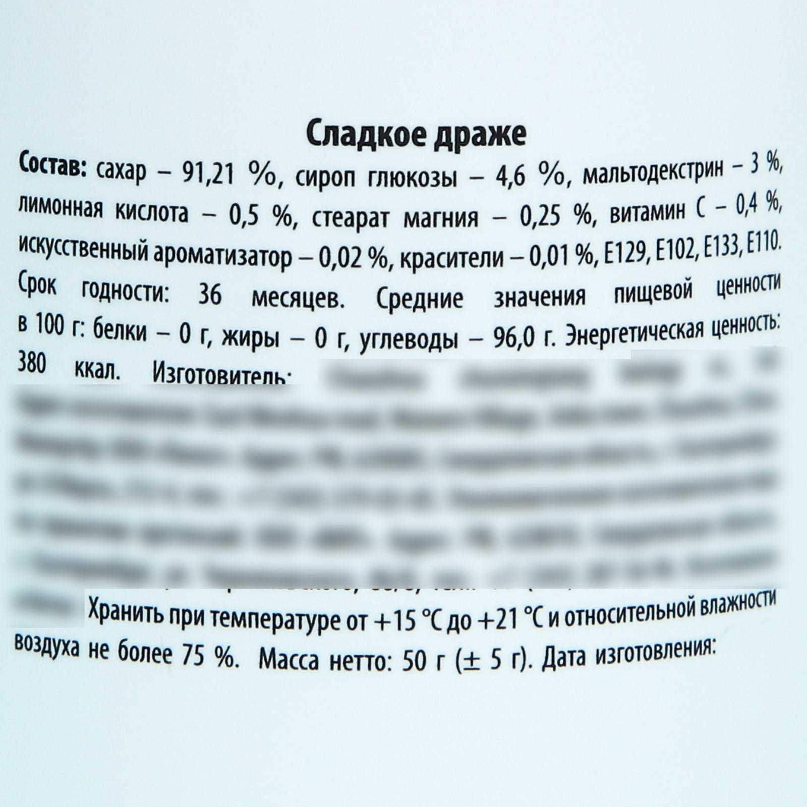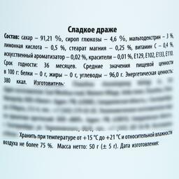 Состав: сахар – 91,21 %, сироп глюкозы – 4,6 %, мальтодекстрин – 3 %, лимонная кислота – 0,5 %, стеарат магния – 0,25 %, витамин C – 0,4 %, искусственный ароматизатор – 0,02 %, красители – 0,01 %, E129, E102, E133, E110.
