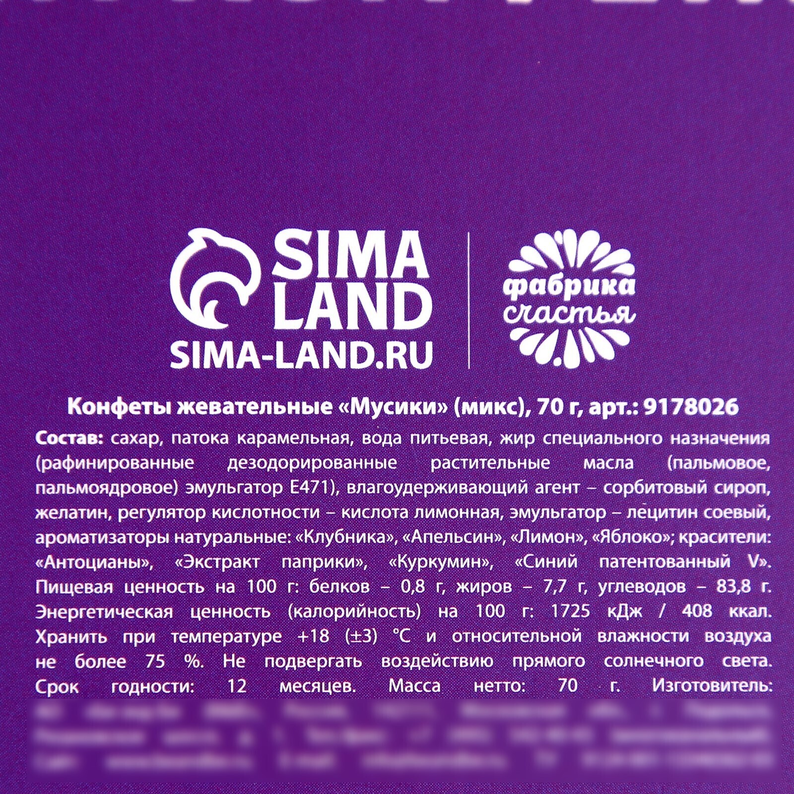 Состав: сахар, патока карамельная, вода питьевая, жир специального назначения (рафинированные дезодорированные растительные масла (пальмовое, пальмоядровое) эмульгатор Е471), влагоудерживающий агент – сорбитовый сироп, желатин, регулятор кислотности – кислота лимонная, эмульгатор – лецитин соевый, ароматизаторы натуральные: «Клубника», «Апельсин», «Лимон», «Яблоко»; красители: «Антоцианы», «Экстракт паприки», «Куркумин», «Синий патентованный V».