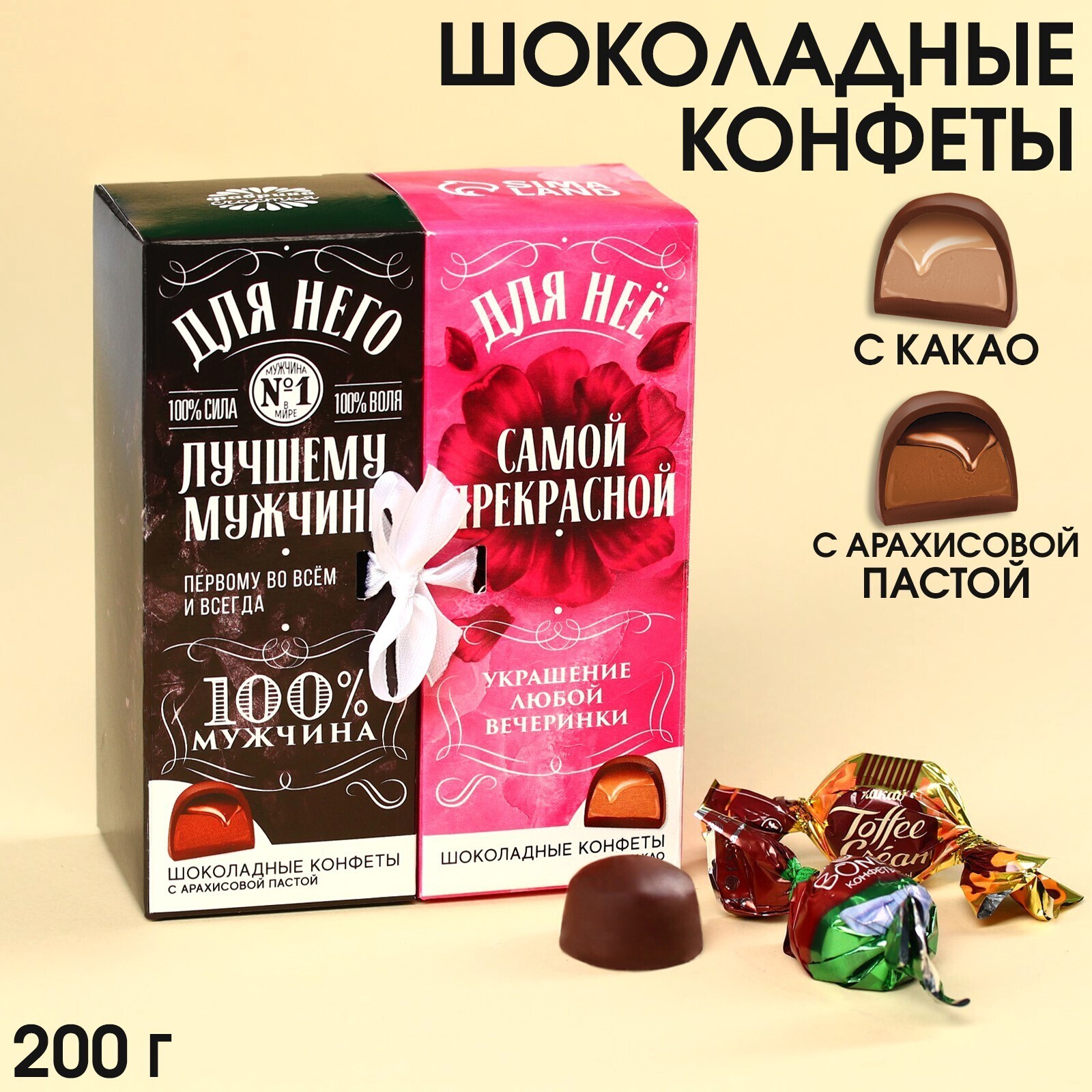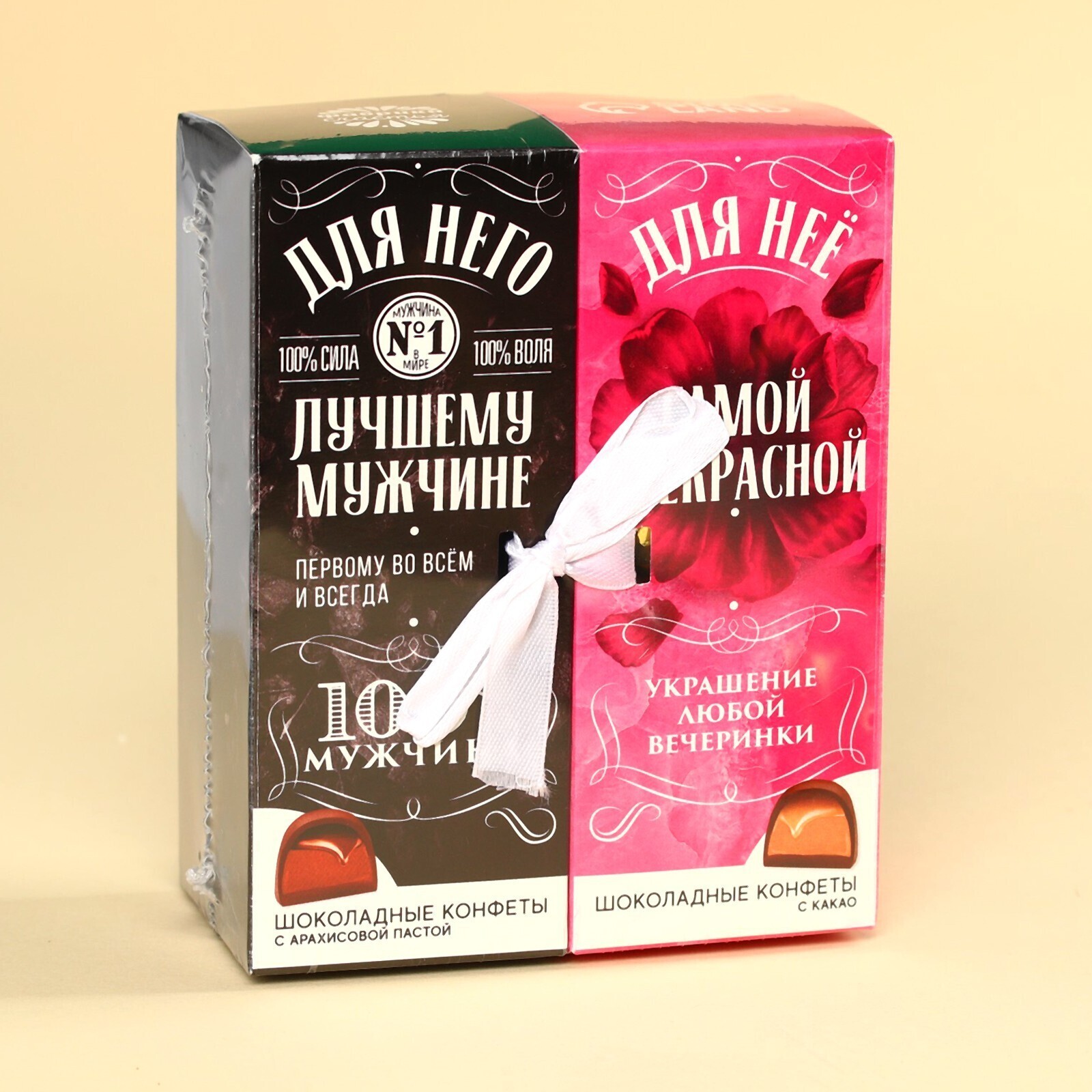 Коробка с двумя видами конфет и лентой "Для него и для нее", 200 г