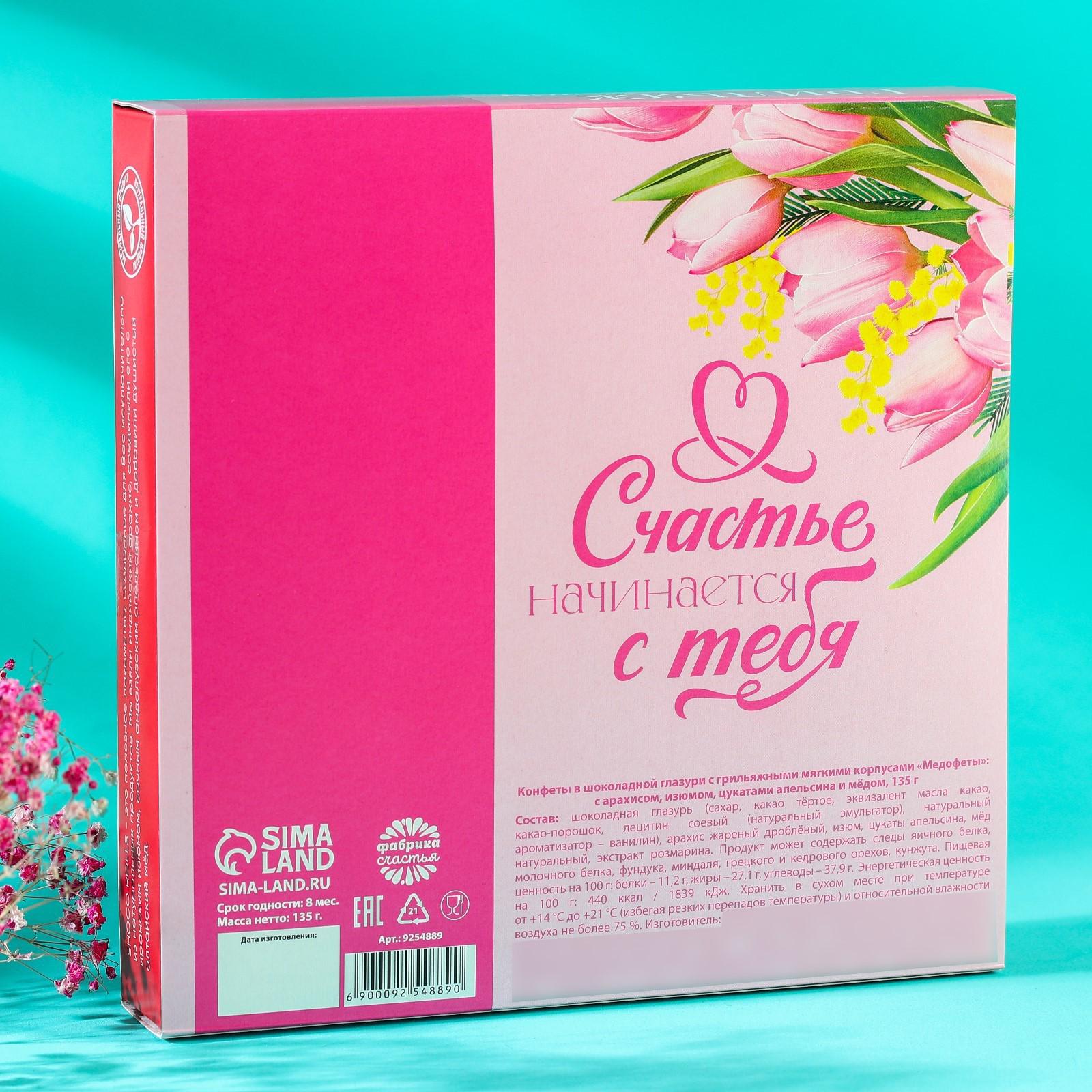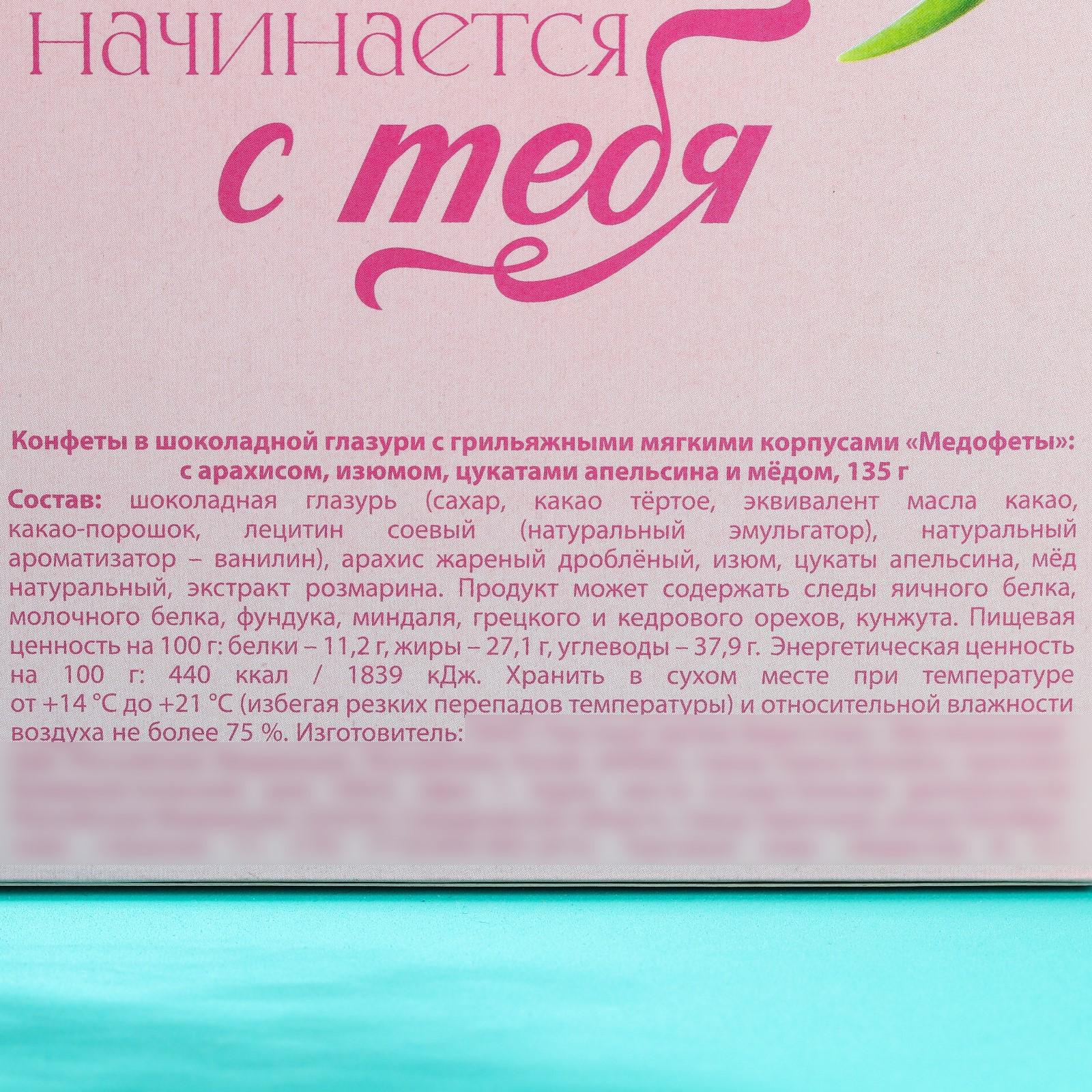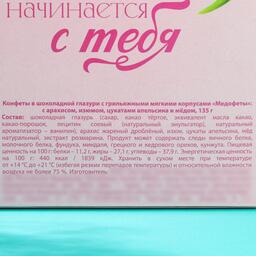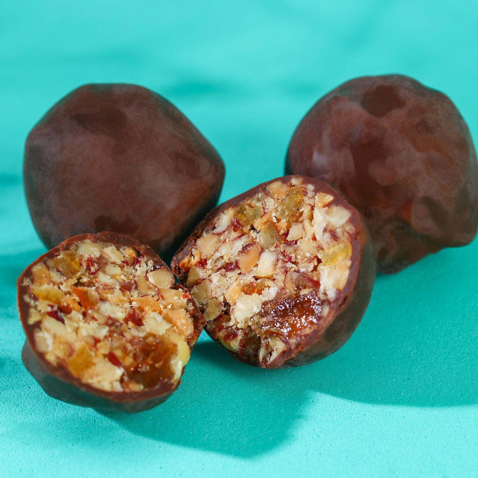 Состав: шоколадная глазурь (сахар, какао тёртое, эквивалент масла какао, какао-порошок, лецитин соевый (натуральный эмульгатор), натуральный ароматизатор – ванилин), арахис жареный дроблёный, изюм, цукаты апельсина, мёд натуральный, экстракт розмарина. Продукт может содержать следы яичного белка, молочного белка, фундука, миндаля, грецкого и кедрового орехов, кунжута.